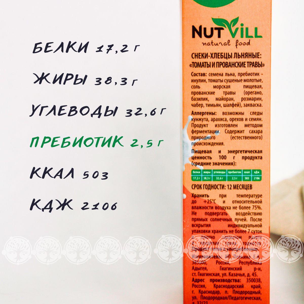 | Состав | семена льна; пребиотик-инулин; томат; орегано; базилик; майоран; шалфей; розмарин; чабер; соль морская пищевая; закваска |