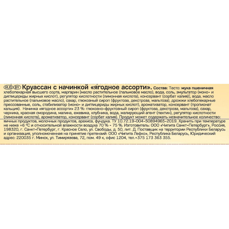 | Состав | тесто: мука пшеничная хлебопекарная высшего сорта, маргарин [масло растительное (пальмовое масло), вода, соль, эмульгатор (моно- и диглицериды жирных кислот), регулятор кислотности (лимонная кислота), консервант (сорбат калия)], вода, масло растительное (пальмовое масло), сахар, глюкозный сироп (фруктоза, декстроза, мальтоза), дрожжи хлебопекарные прессованные, соль, стабилизатор (моно- и диглицериды жирных кислот), ароматизатор, консервант (пропионат кальция); начинка «ягодное ассорти» 23%: глюкозно-фруктозный сироп (фруктоза, декстроза, мальтоза), сахар, черника, красная смородина, малина, ежевика, клубника, вода, желирующий агент (пектин), регулятор кислотности (лимонная кислота), ароматизатор, консервант (сорбат калия) |