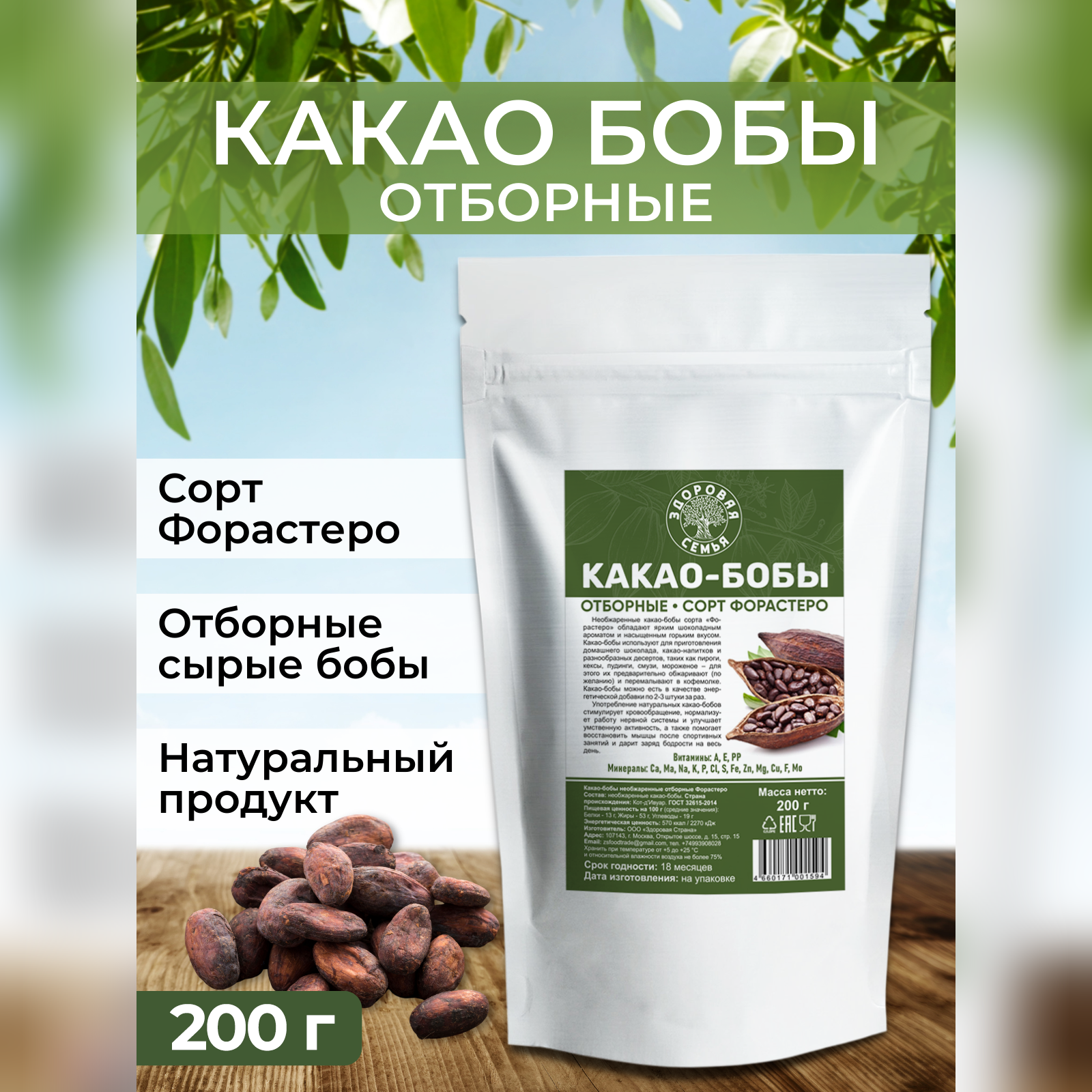 Какао-бобы, сорт Форастеро, Здоровая Семья, сырые необжаренные отборные, 200 г интересное: