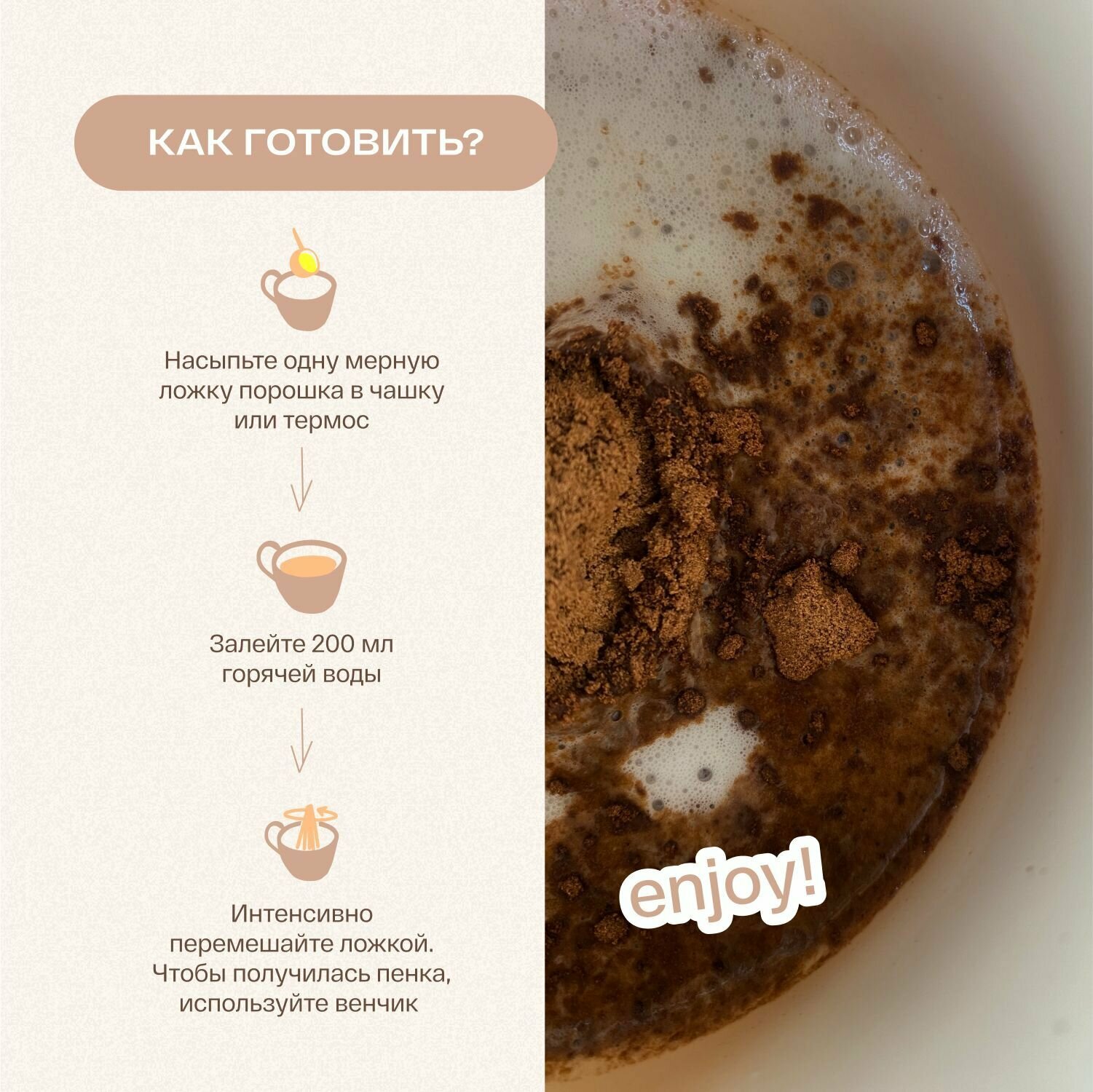 | Способ приготовления | 1. Насыпьте содержимое в чашку или термос. 2. Залейте 200 мл горячей воды 80 ºC. 3. Интенсивно перемешайте. Чтобы получилась пенка, используйте венчик. |