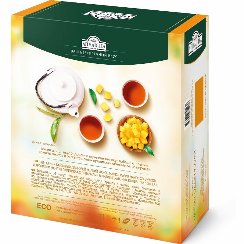 | Состав | чай черный Ahmad Tea Mango Magic со вкусом и ароматом манго в пакетиках 1,5 г х 100 шт |