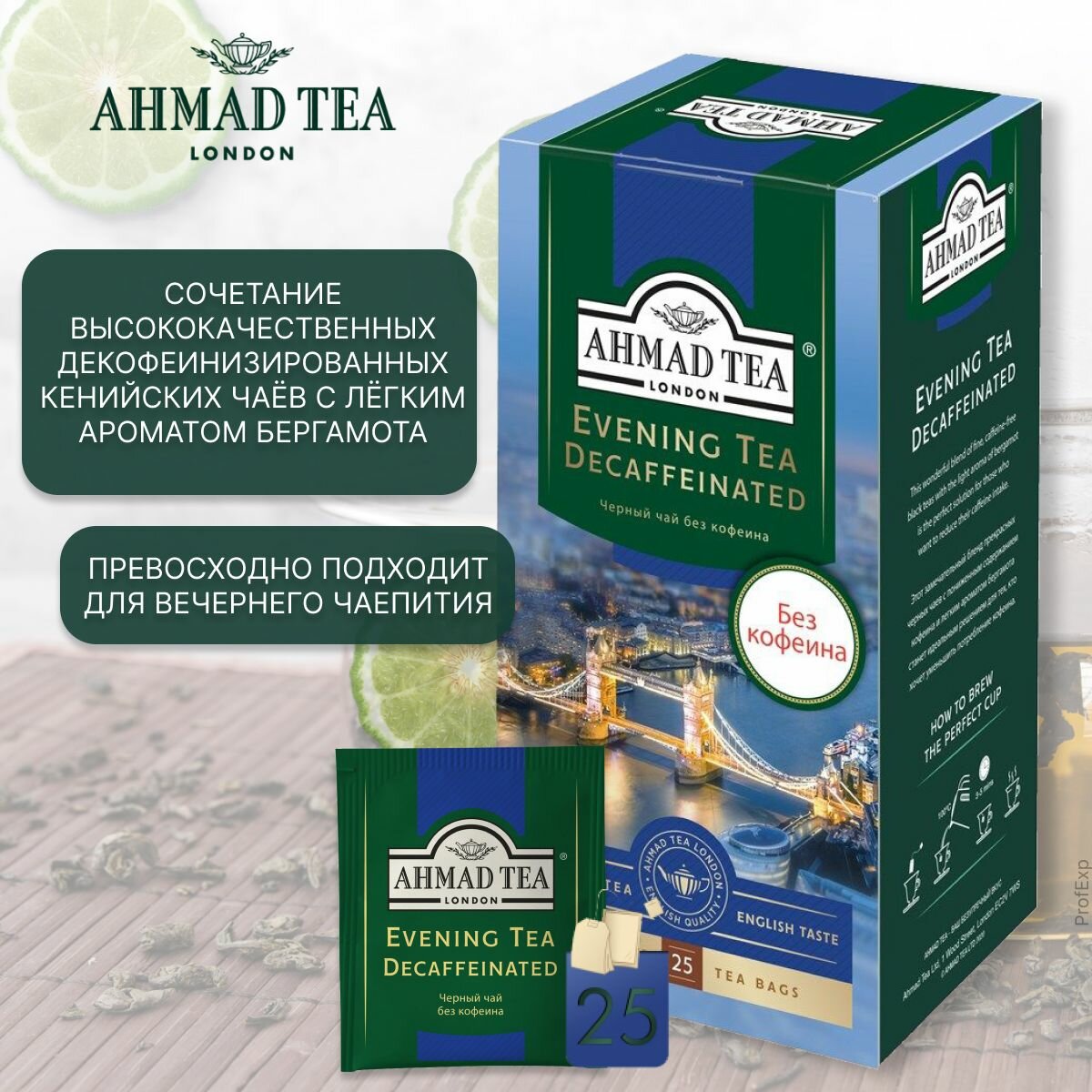Купить Чай "Ahmad Tea", Вечерний Чай, с ароматом бергамота, декоф., черный, пак. в к/фольги, 25х1,8г
