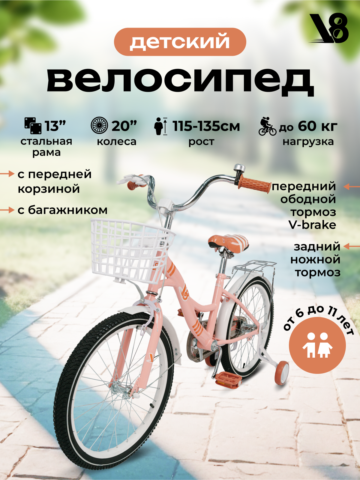 Велосипед детский 20" V8 V-X20P светло-розовый для девочек, подходит на рост 115-135 см от 6 до 11 лет интересное: