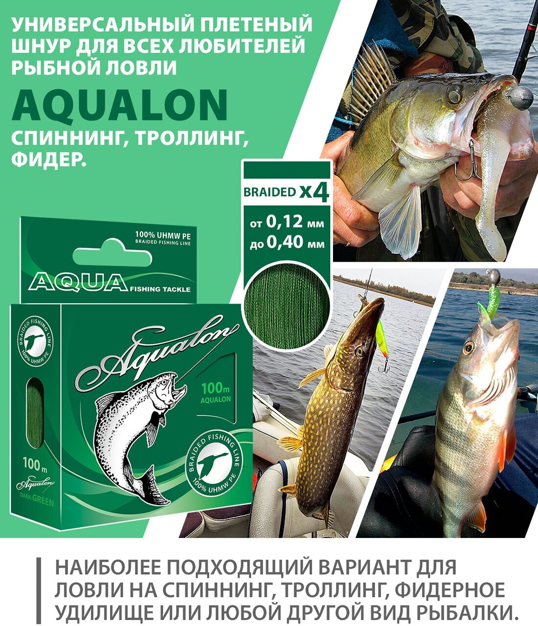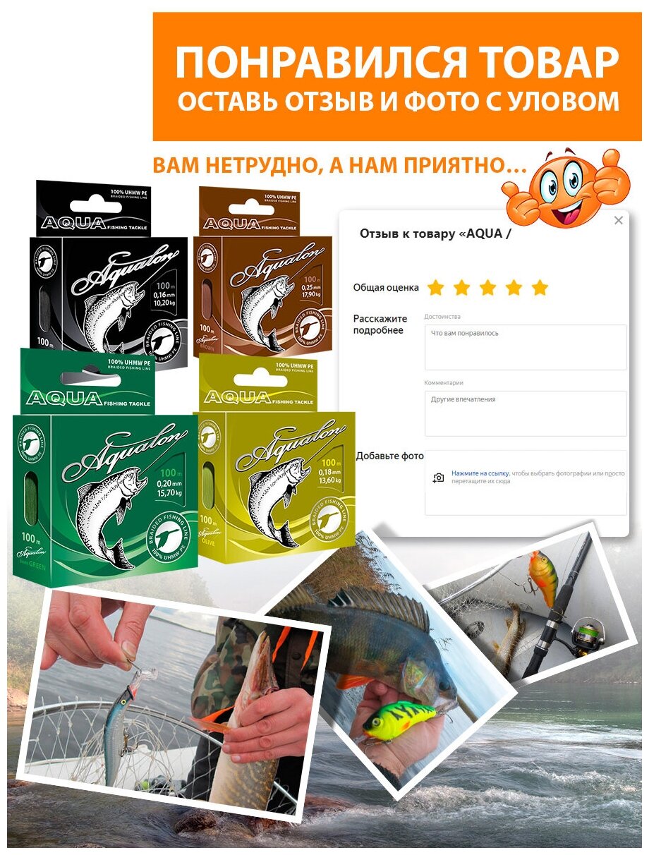 Ниже Вы можете прочитать отзывы на Плетеный шнур для рыбалки AQUA Aqualon 100m 0.35mm 32kg темно-зеленый, ознакомится с подробными характеристиками, посмотреть интересные обзоры и фотографии на Плетеный шнур для рыбалки AQUA Aqualon 100m 0.35mm 32kg темно-зеленый.