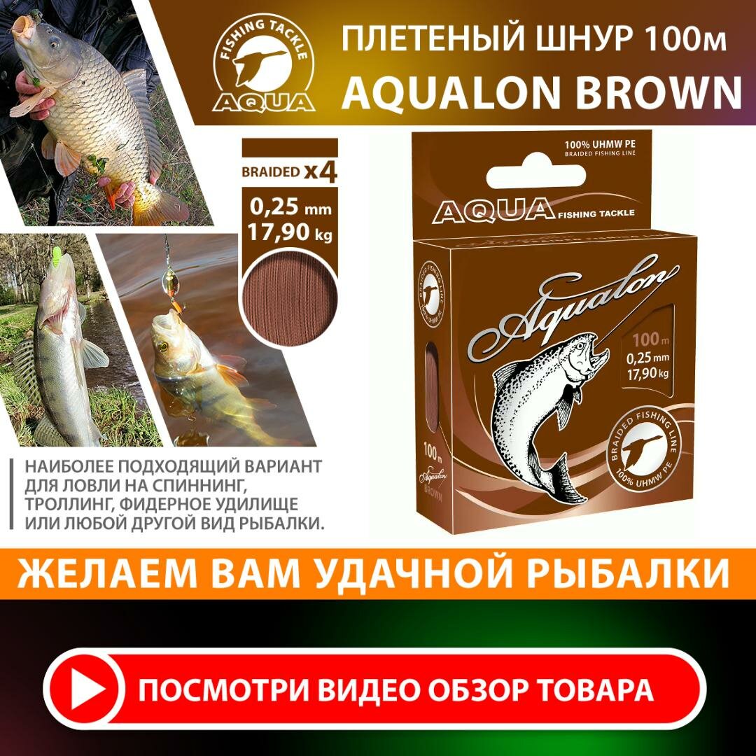 Ниже Вы можете прочитать отзывы на Плетеный шнур для рыбалки AQUA Aqualon 100m 0.25mm 17.9kg коричневый, ознакомится с подробными характеристиками, посмотреть интересные обзоры и фотографии на Плетеный шнур для рыбалки AQUA Aqualon 100m 0.25mm 17.9kg коричневый.