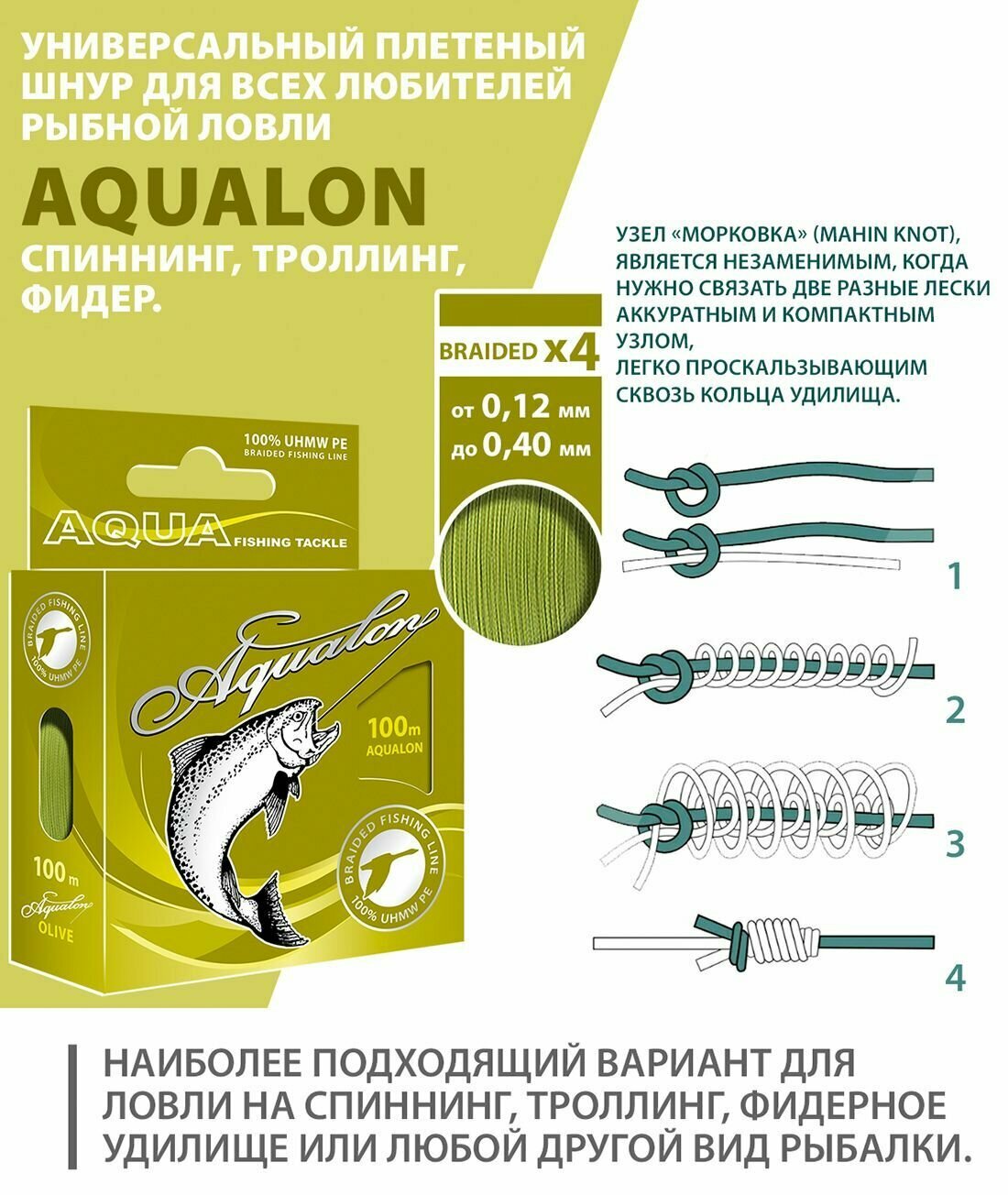 Ниже Вы можете прочитать отзывы на Плетеный шнур AQUA Aqualon 100м 0,18мм Olive, ознакомится с подробными характеристиками, посмотреть интересные обзоры и фотографии на Плетеный шнур AQUA Aqualon 100м 0,18мм Olive.