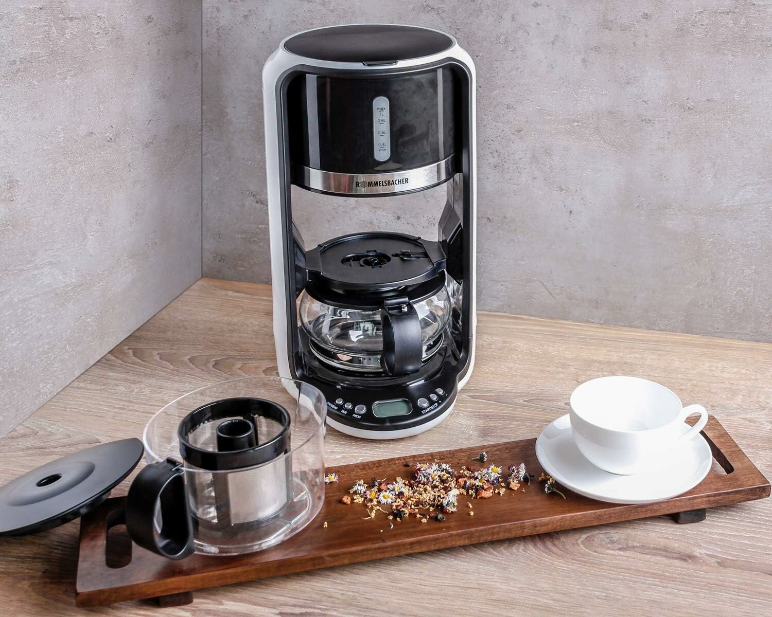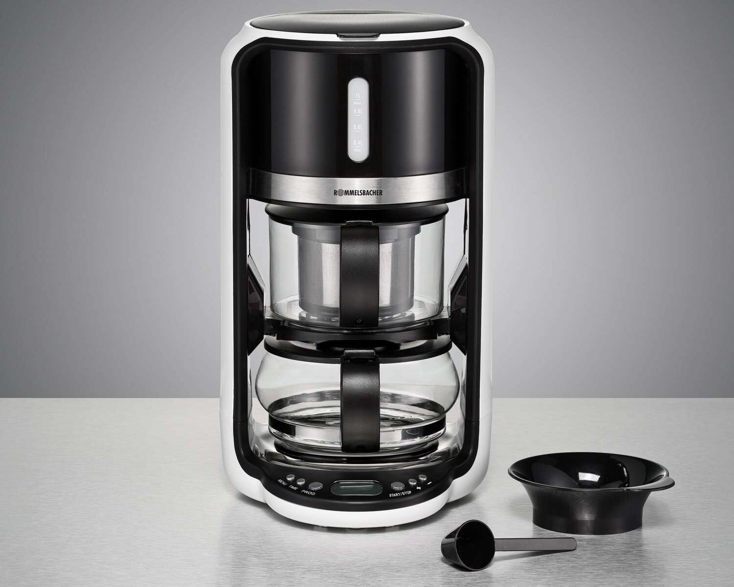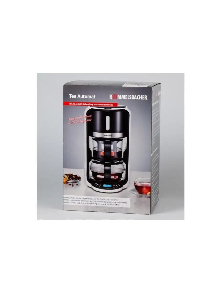 Чайная машина ROMMELSBACHER TA 1200 5 программ, 4 температуры заваривания (80/85/90/100 C), время заваривания до 10 минут, функция подогрева, отсрочка запуска, стеклянный чайник, ситечко для чая из нержавеющей стали, 1200 Вт Энергия Класс Б