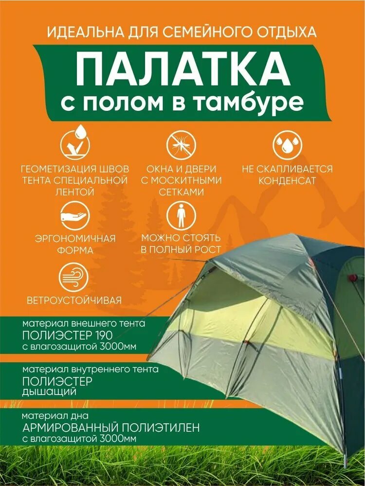 Палатка шатер туристическая 4 местная MirCamping 1100 с тамбуром и двумя комнатами для отдыха на природе