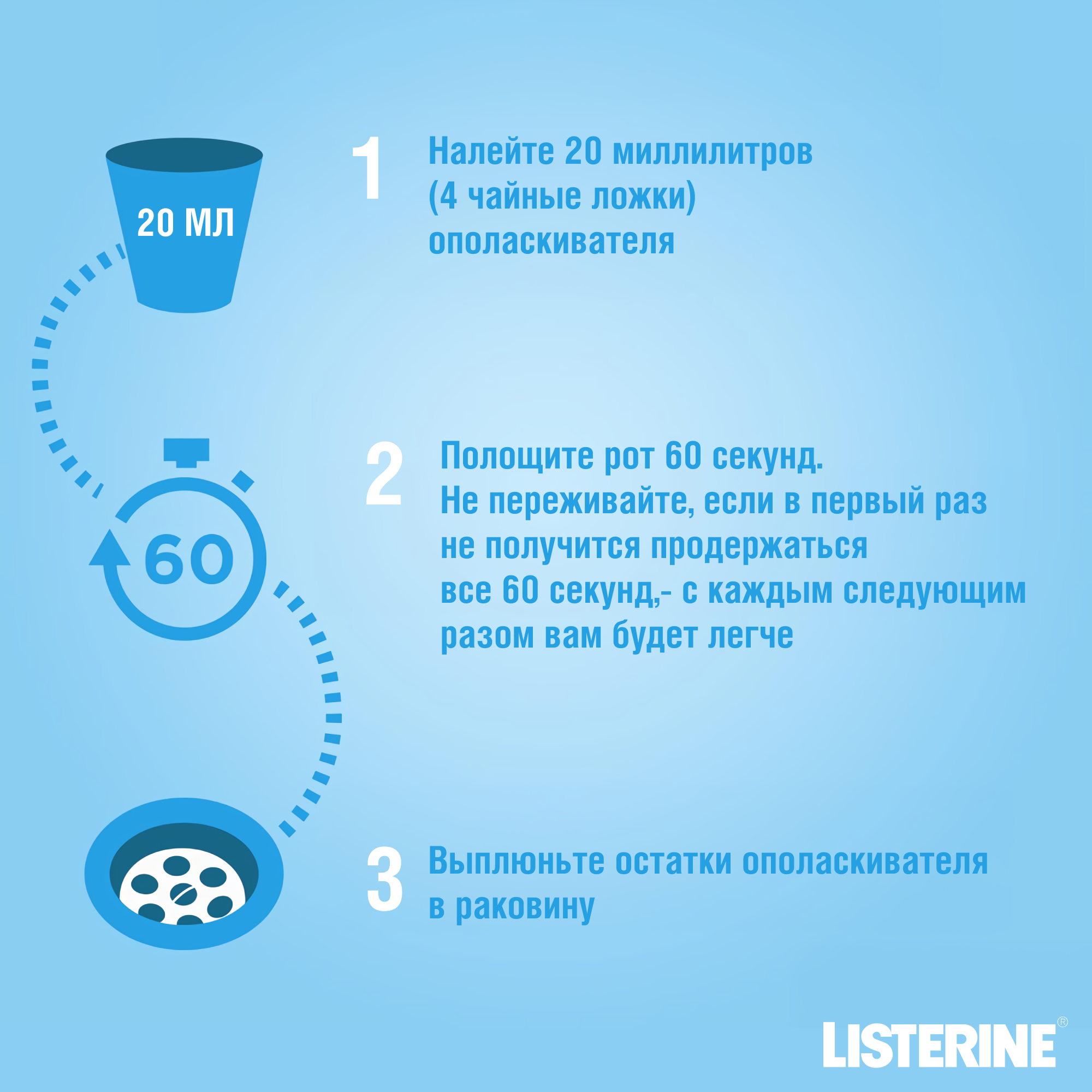 | Способ применения | Налейте 20 миллилитров (4 чайные ложки) ополаскивателя. Вылейте содержимое стаканчика в рот. Не разводите ополаскиватель водой. Полощите рот 30 секунд. Выплюньте остатки ополаскивателя в раковину. Примечание: после этой процедуры важно воздерживаться от еды и питья в течении 30 минут |