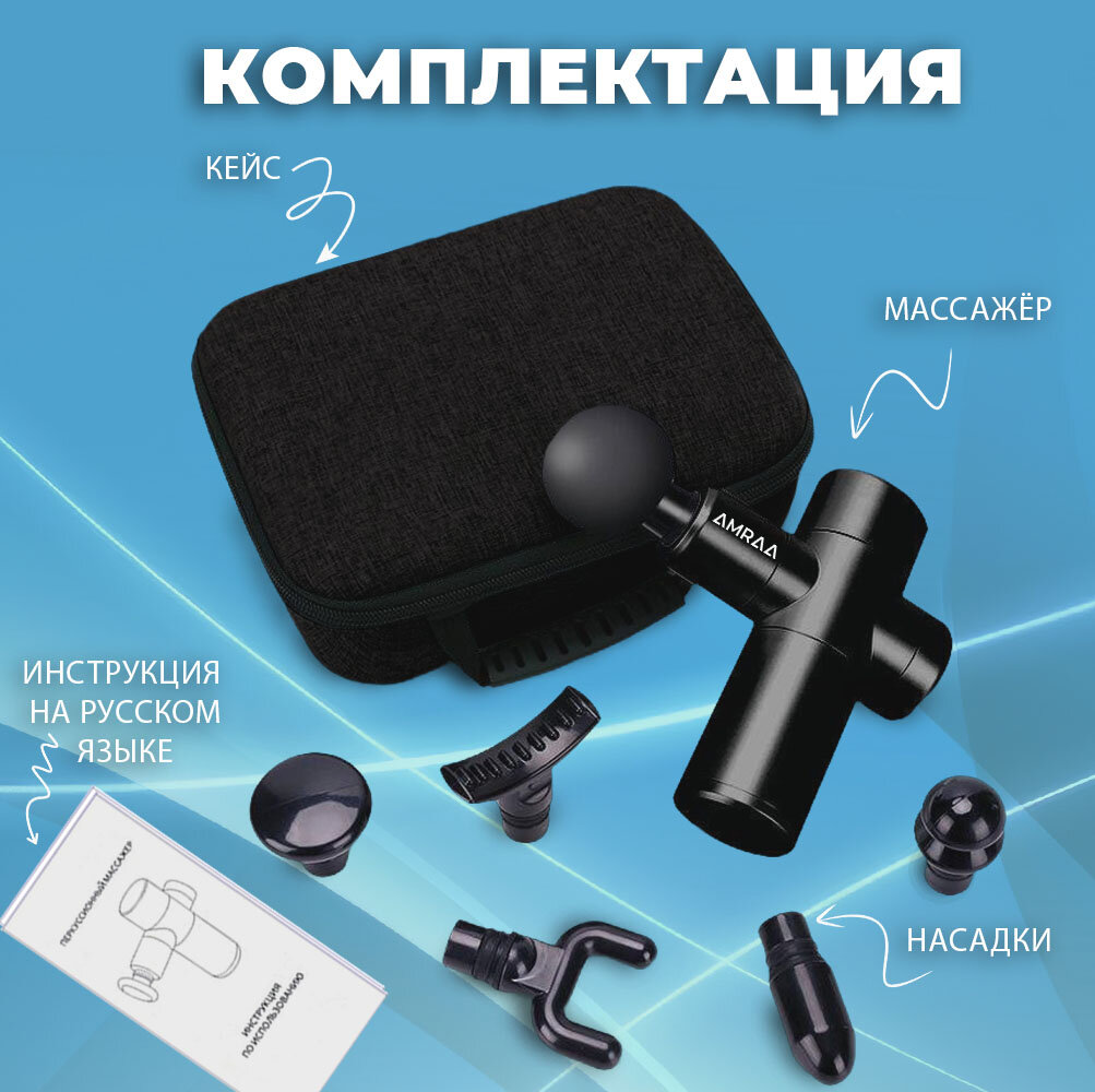 | Подробная комплектация | Перкуссионный массажер - 1шт Зарядный кабель - 1шт Насадки - 6шт Защитный кейс - 1шт инструкция - 1шт |