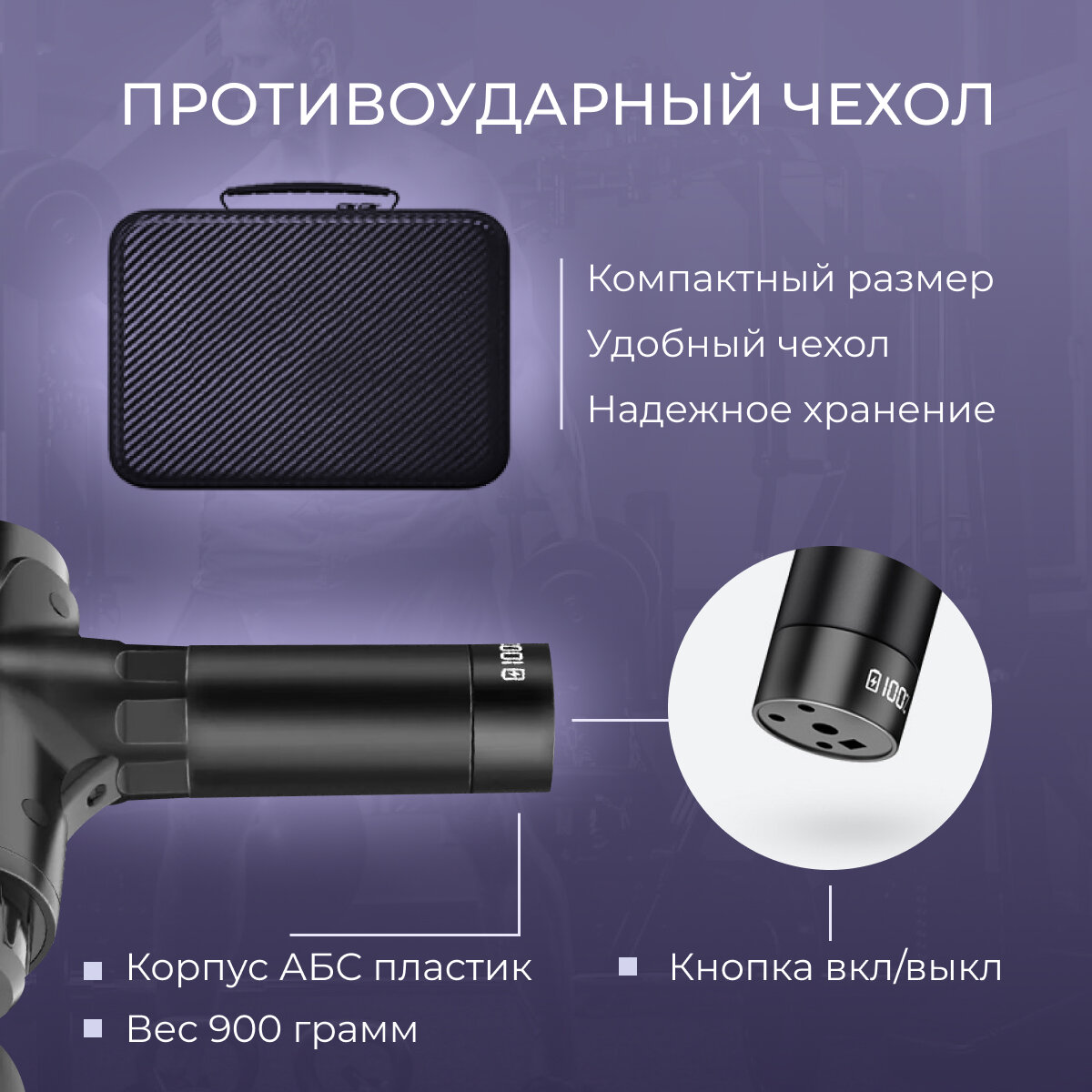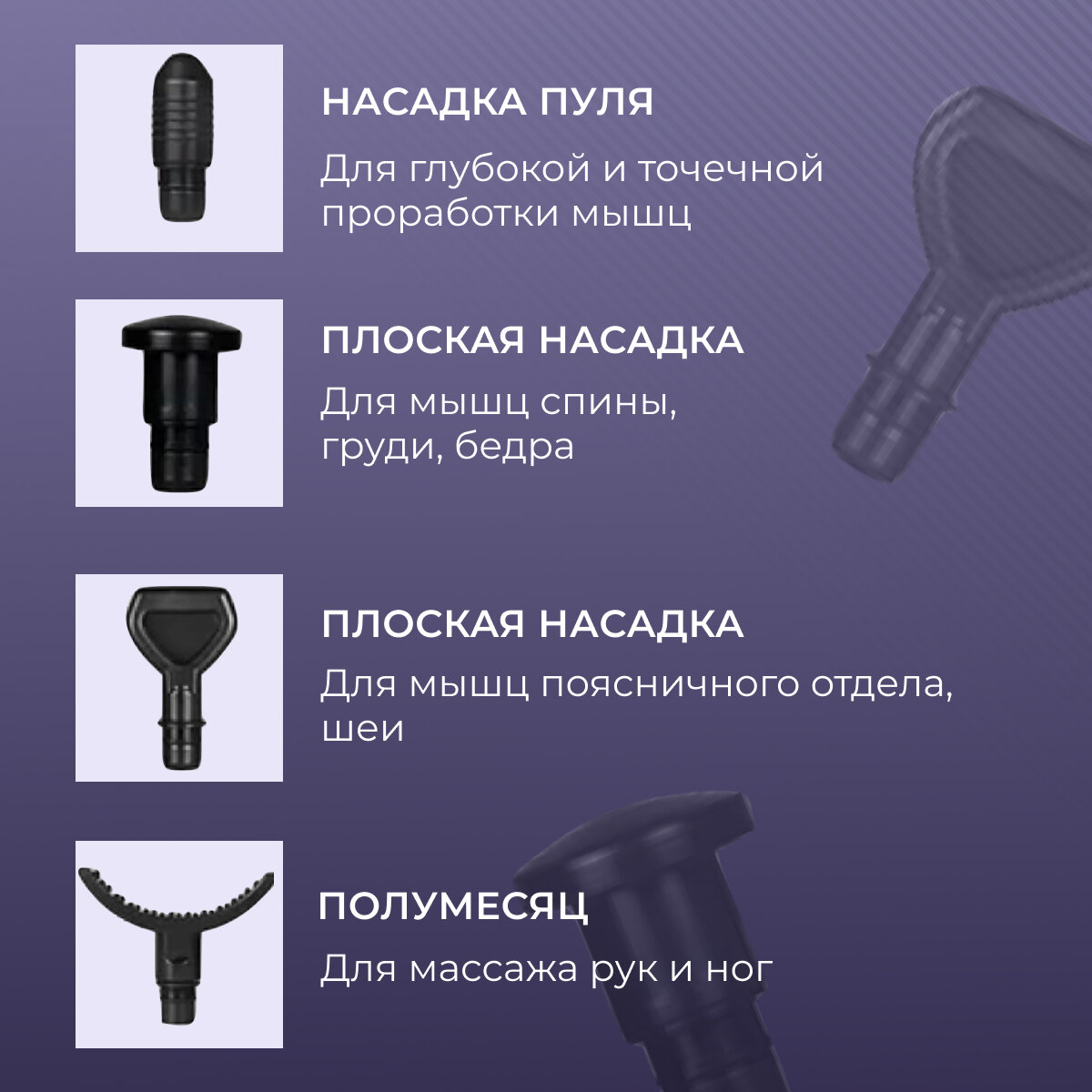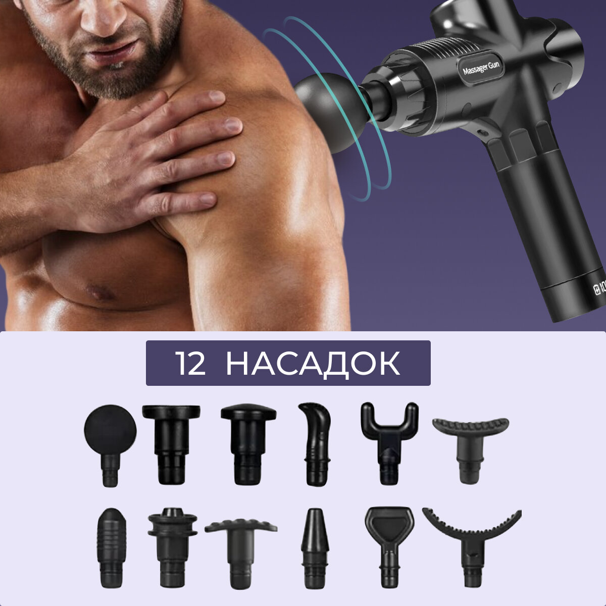 | Подробная комплектация | 12 насадок, противоударный чехол, кабель зарядки, инструкция (англ) , пистолет массажер |