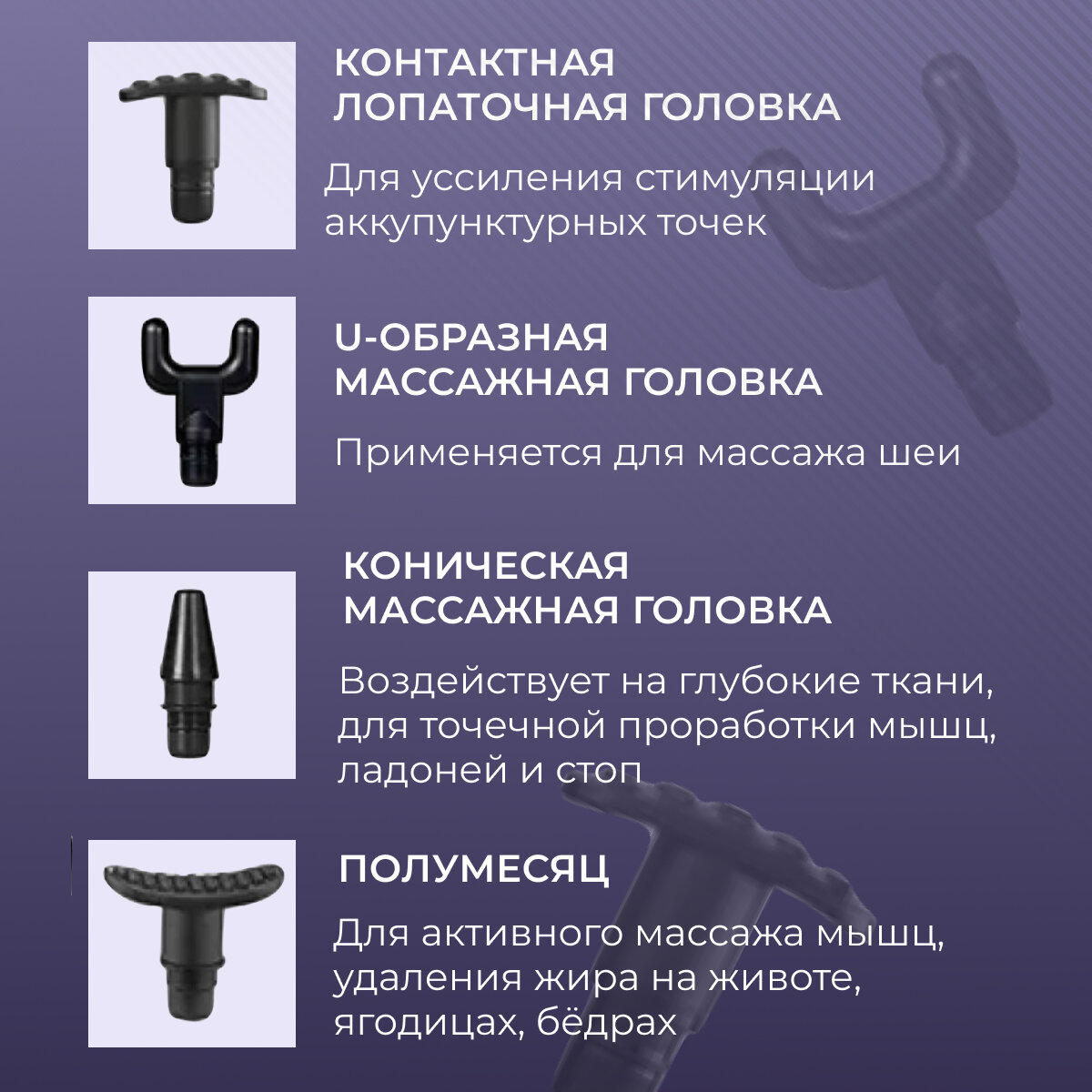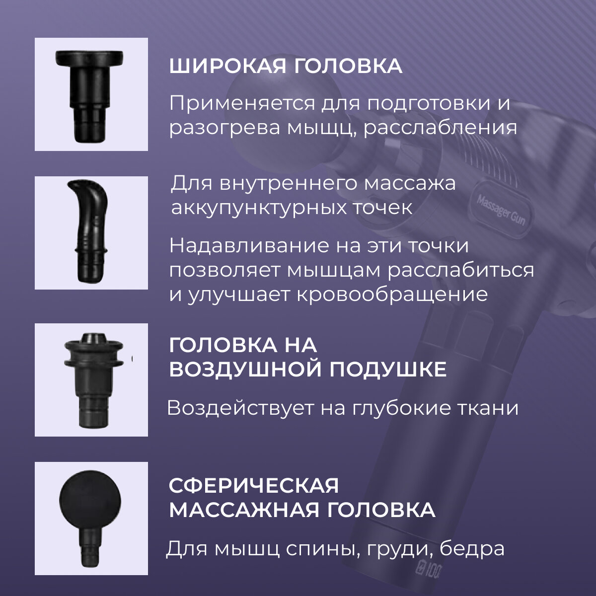 | Вид массажа | вибрационный / комбинированный / механический / перкуссионный / расслабляющий / рефлекторный |