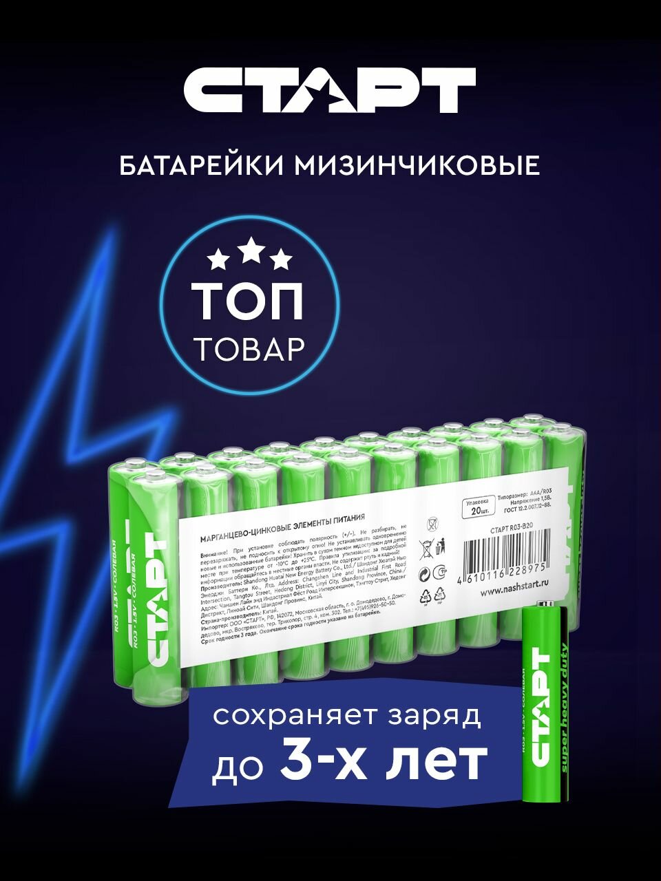 Ниже Вы можете прочитать отзывы на Батарейки солевые старт R03-B20, ААА, 20 штук, ознакомится с подробными характеристиками, посмотреть интересные обзоры и фотографии на Батарейки солевые старт R03-B20, ААА, 20 штук.