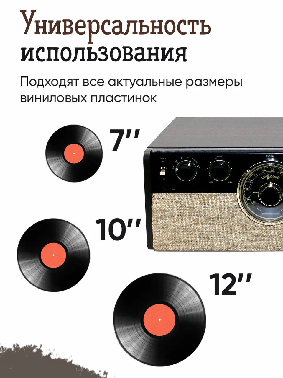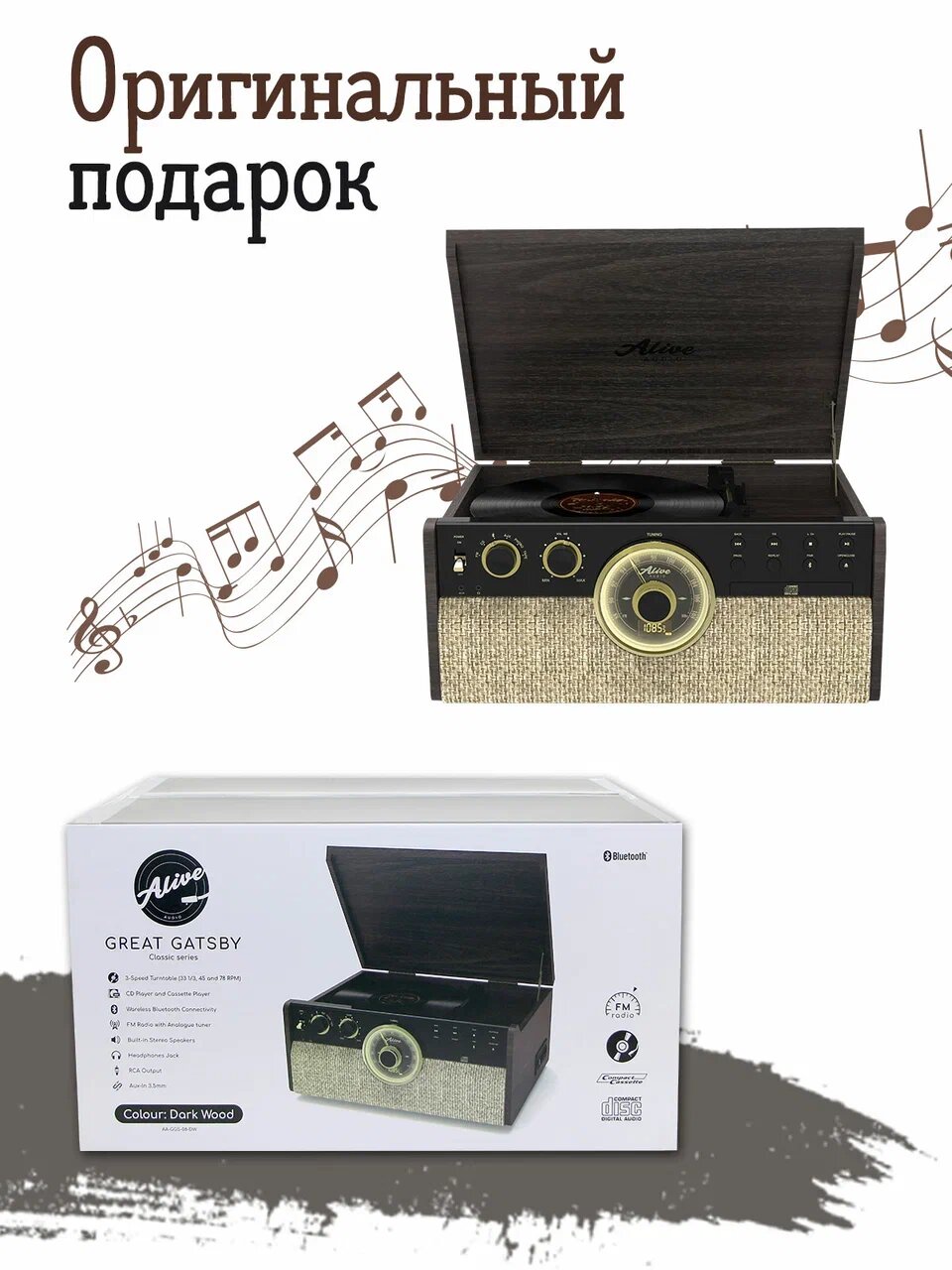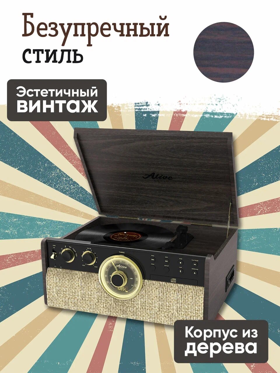 Виниловый проигрыватель Alive Audio Great Gatsby Dark Wood (CD, FM-радио, кассетник, Bluetooth, встроенные динамики) интересное: