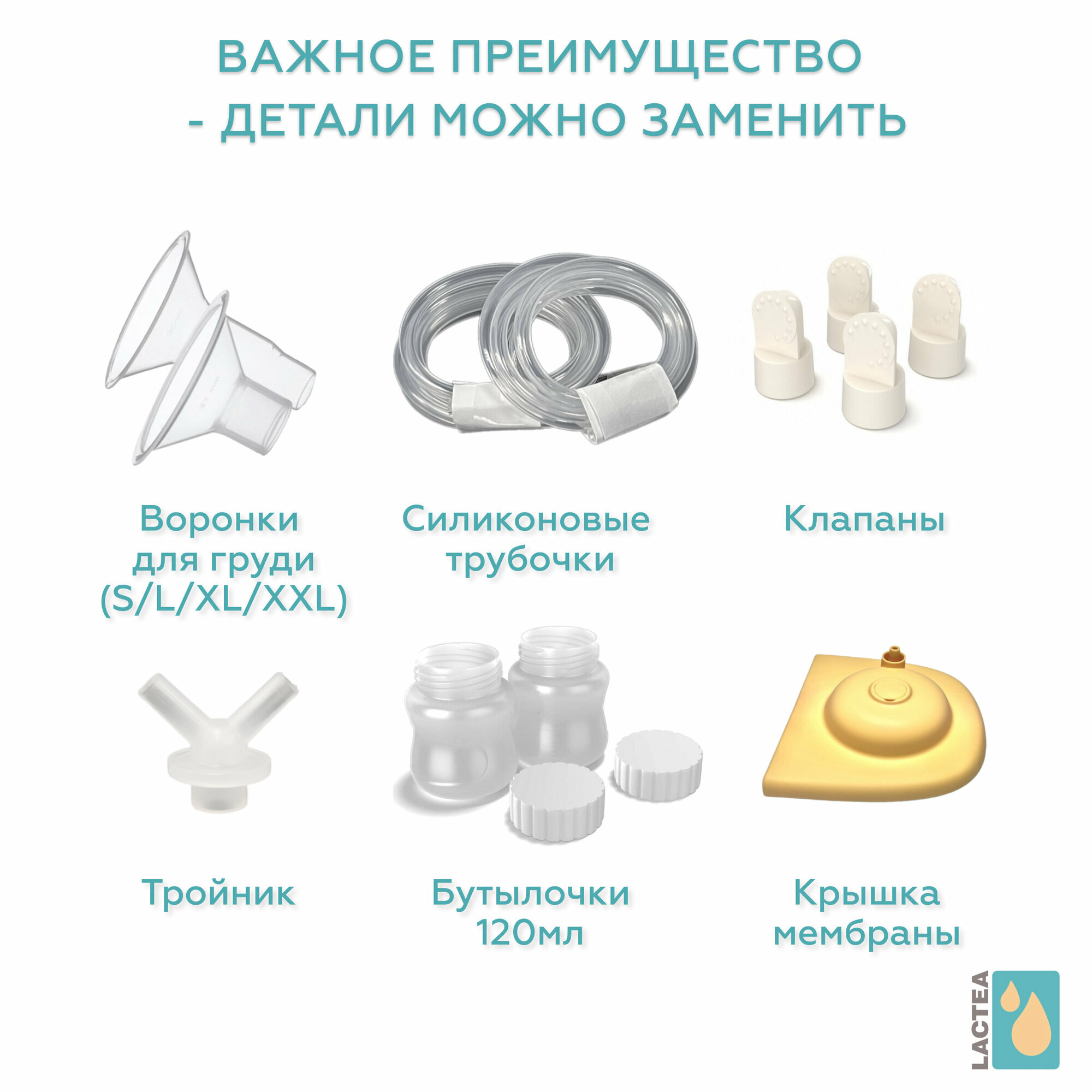 | Подробная комплектация | Корпус молокоотсоса - 1 шт; адаптер AC/DC - 1 шт; воронка размер М - 2 шт; коннектор - 2 шт; клапан с мембраной - 4 шт; бутылочка 120 мл. - 2 шт; крышка бутылочки - 2 шт; тройник - 1 шт. |