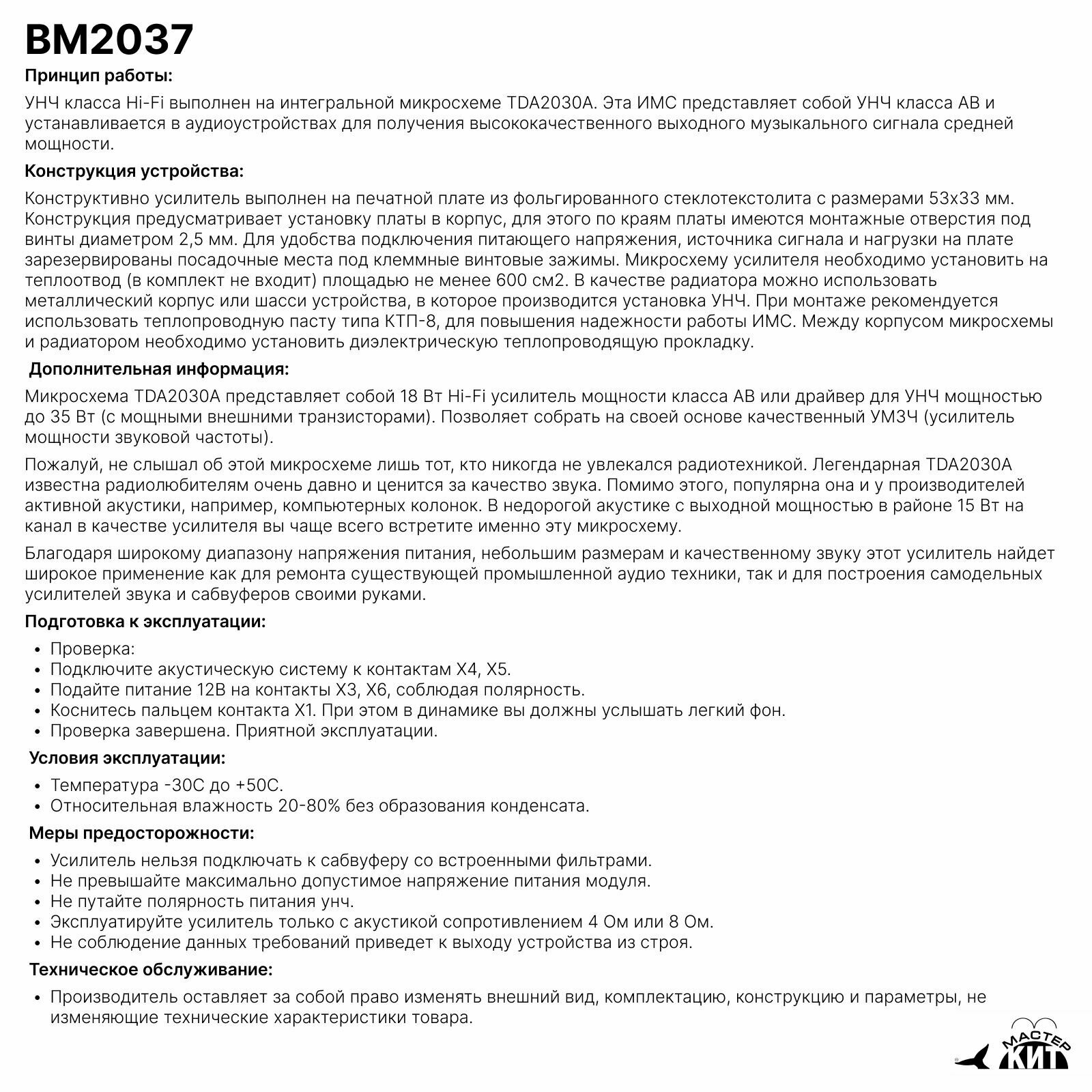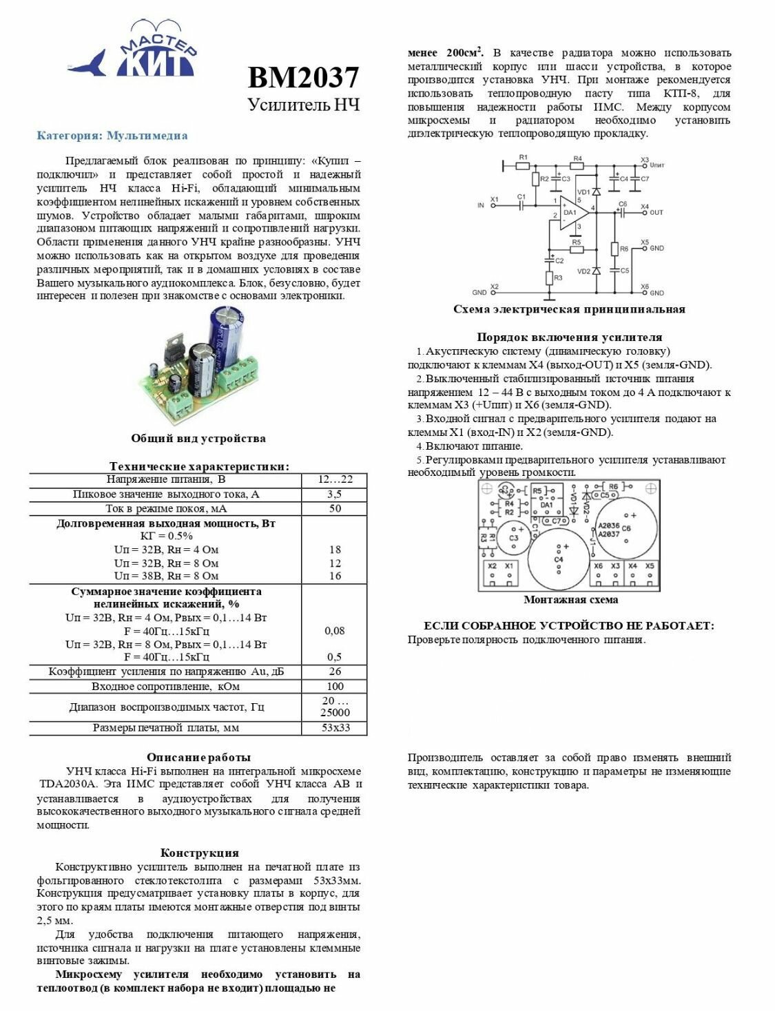 Усилитель НЧ класса АВ, 18 Вт, моно (TDA2030), BM2037 интересное: