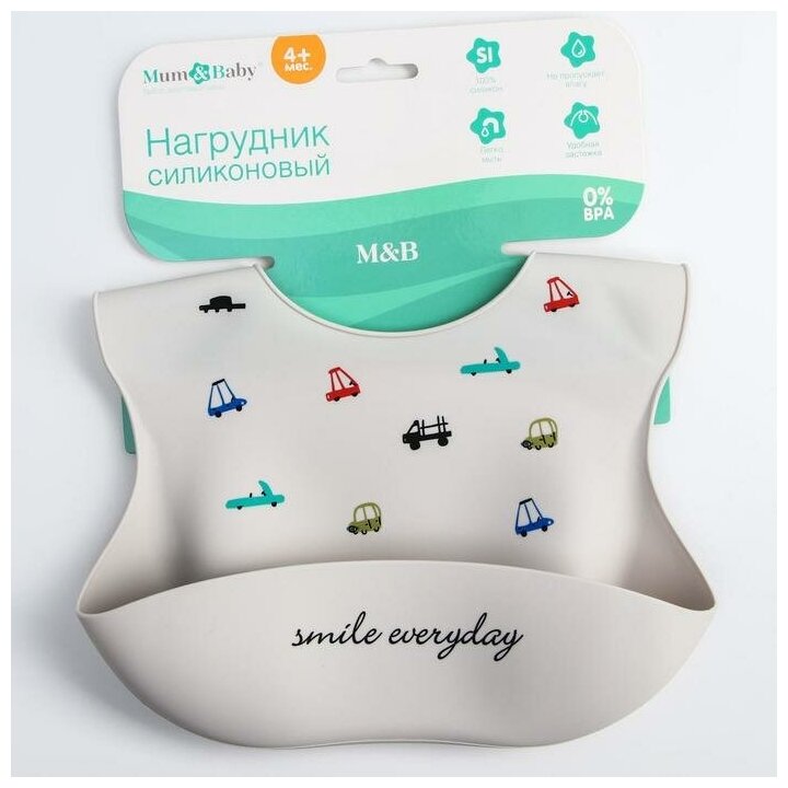 СохранитьНагрудник силиконовый, на кнопках, с карманом "Машинки", цвет серый 5385574 интересное: