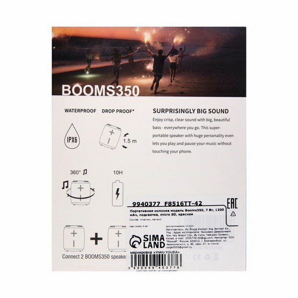 Портативная колонка Booms350, 7 Вт, 1200 мАч, подсветка, micro SD, красная интересное: