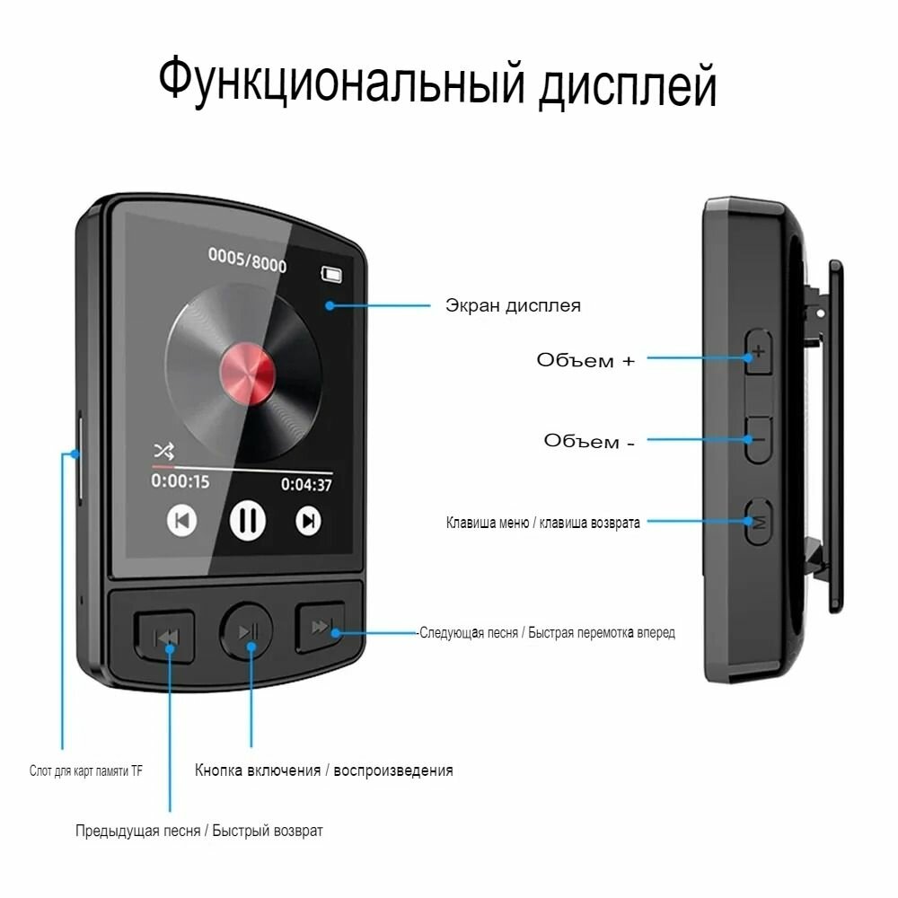 mp3 плеер с bluetooth с диктофоном. Сенсорный мп3 плеер для музыки с блютуз, с клипсой, 16 ГБ. интересное: