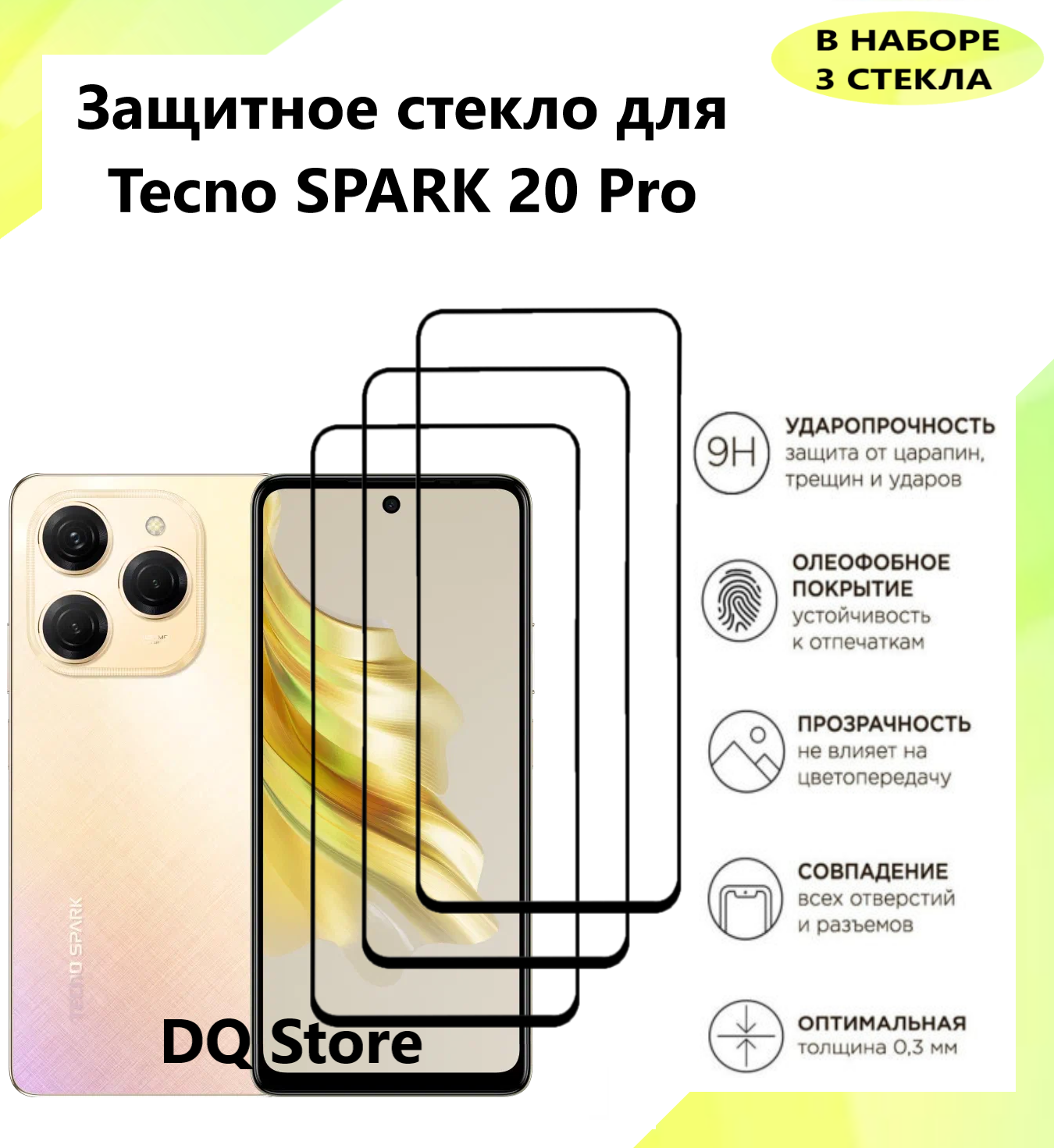 Купить 3 Защитных стекла на Tecno Spark 20 Pro / Техно Спарк 20 Про . Полноэкранные защитные стекла с олеофобным покрытием