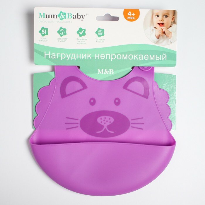 Купить Нагрудник силиконовый с карманом, «Котик», цвет фиолетовый
