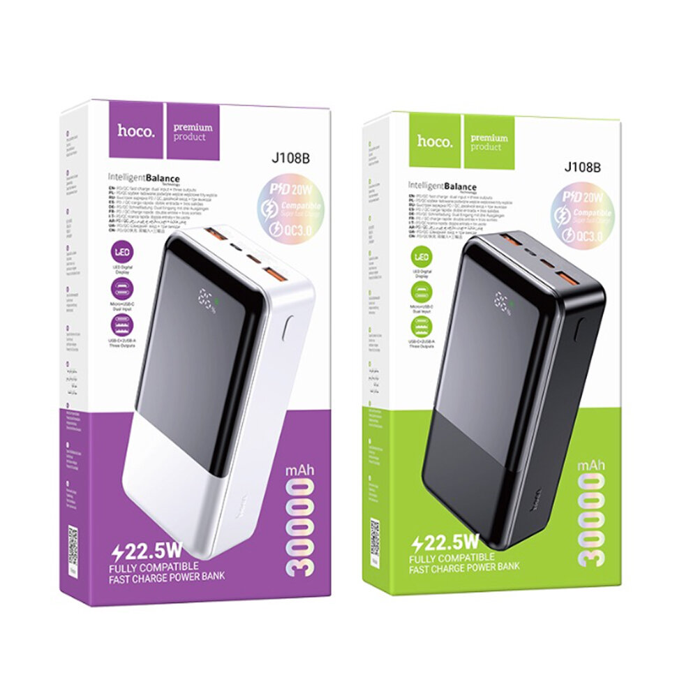 Универсальный Доп. Аккумулятор 30000mAh, J108B, HOCO, выход: 1 USB (22.5W)+1 PD (18W), белый