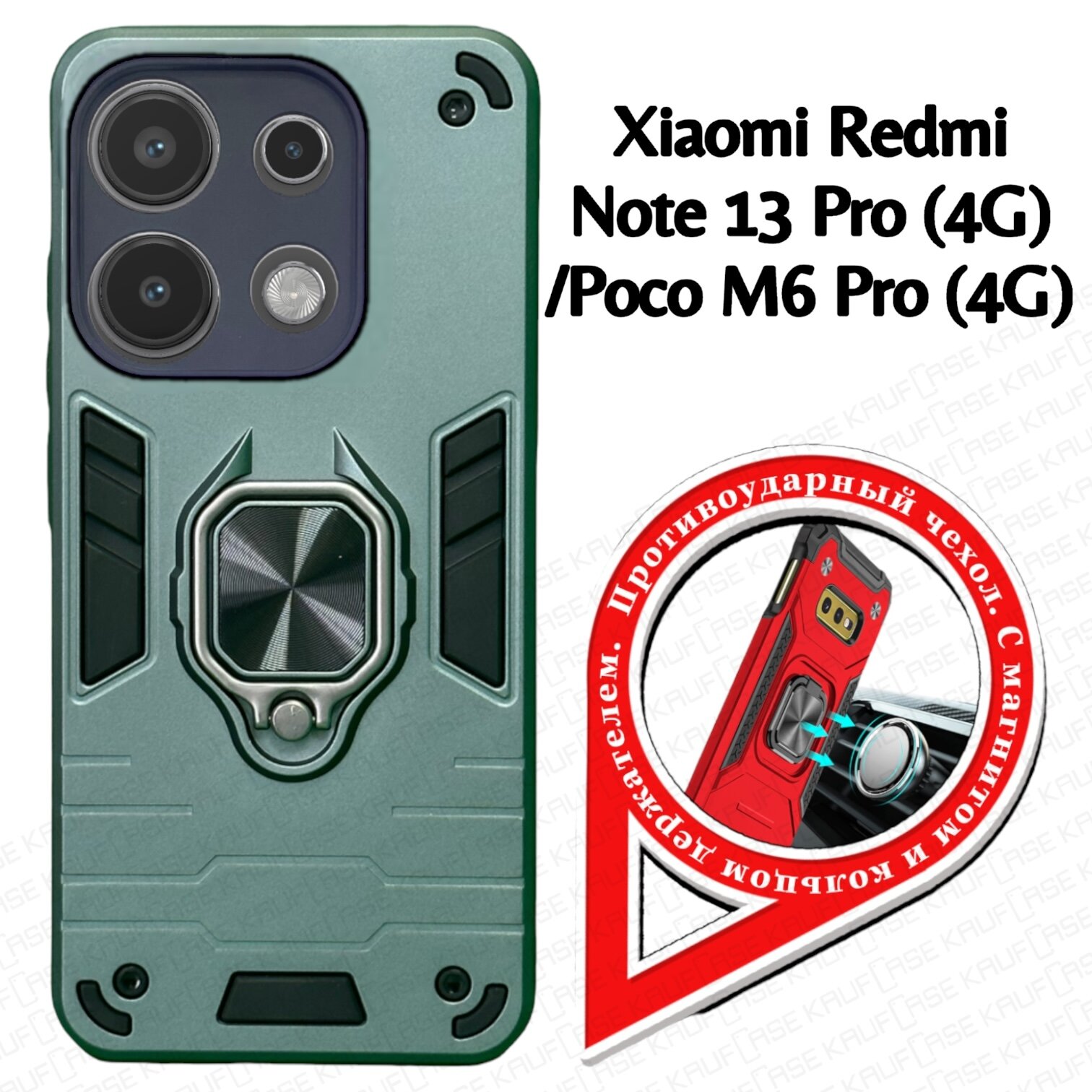 СохранитьПротивоударный чехол на Xiaomi Redmi Note 13 Pro 4G/ Poco M6 Pro (6.67"), темно-зеленый. Кольцо-держатель и магнитное крепление, яркие пластиковые защитные вставки интересное: