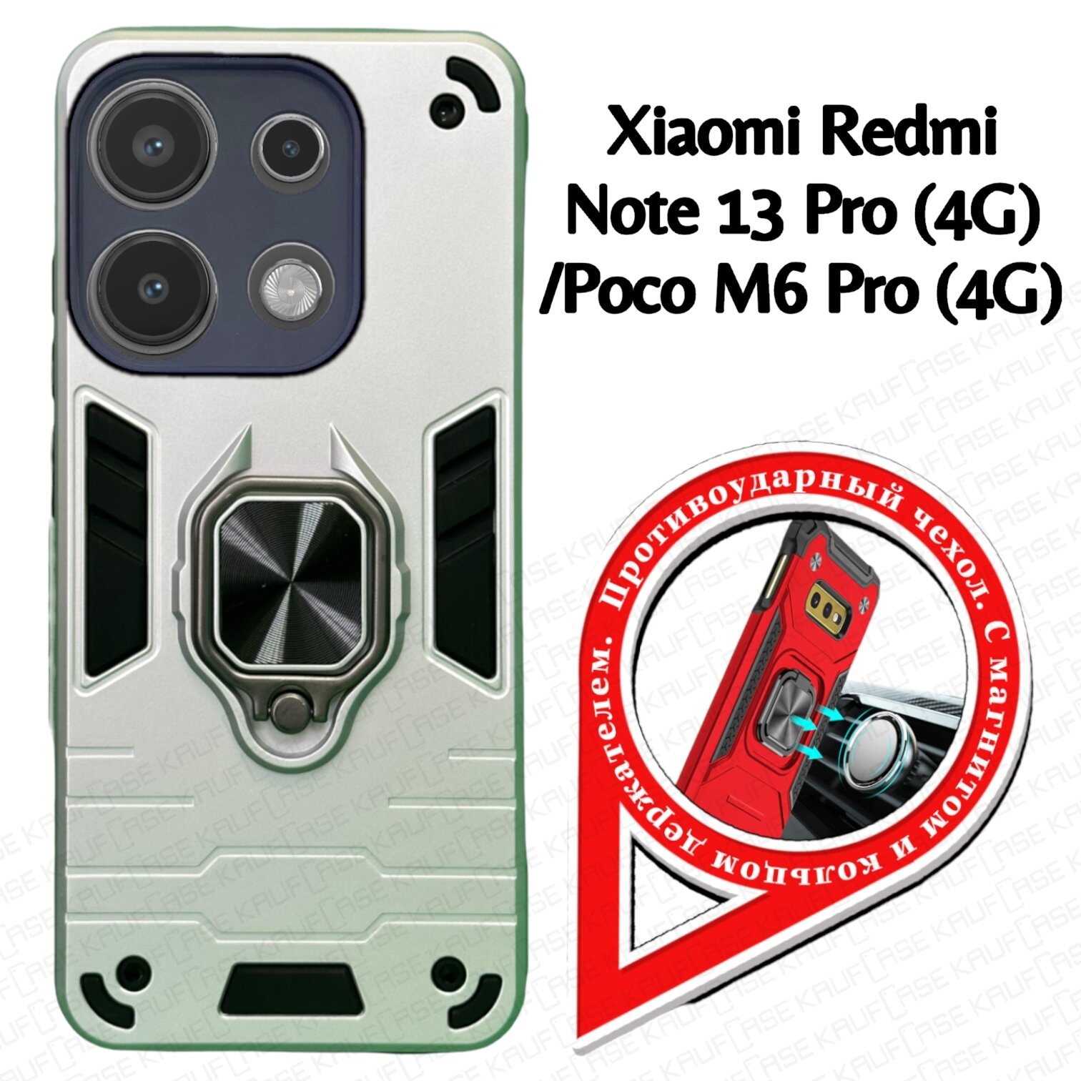 СохранитьПротивоударный чехол на Xiaomi Redmi Note 13 Pro 4G/ Poco M6 Pro (6.67"), серебро. Кольцо-держатель и магнитное крепление, яркие пластиковые защитные вставки интересное: