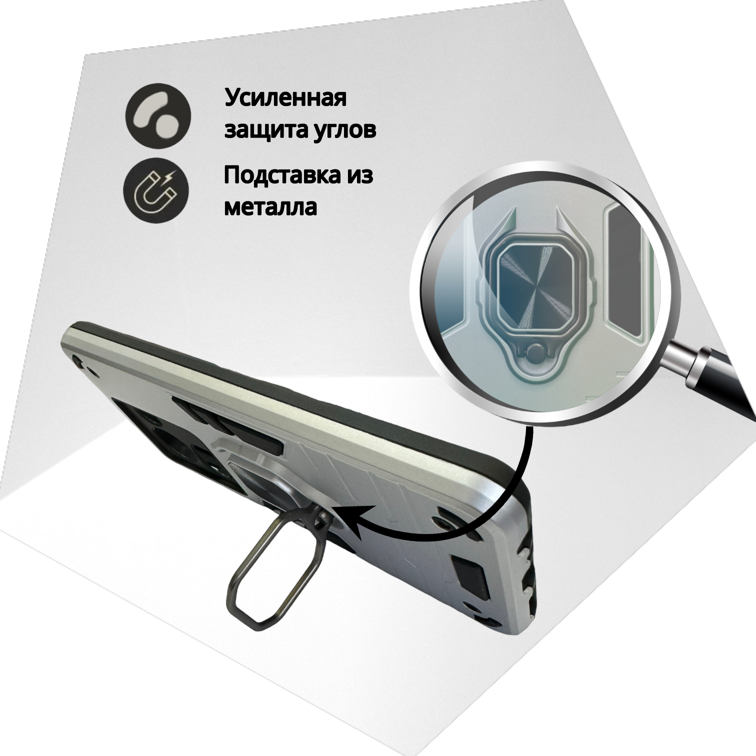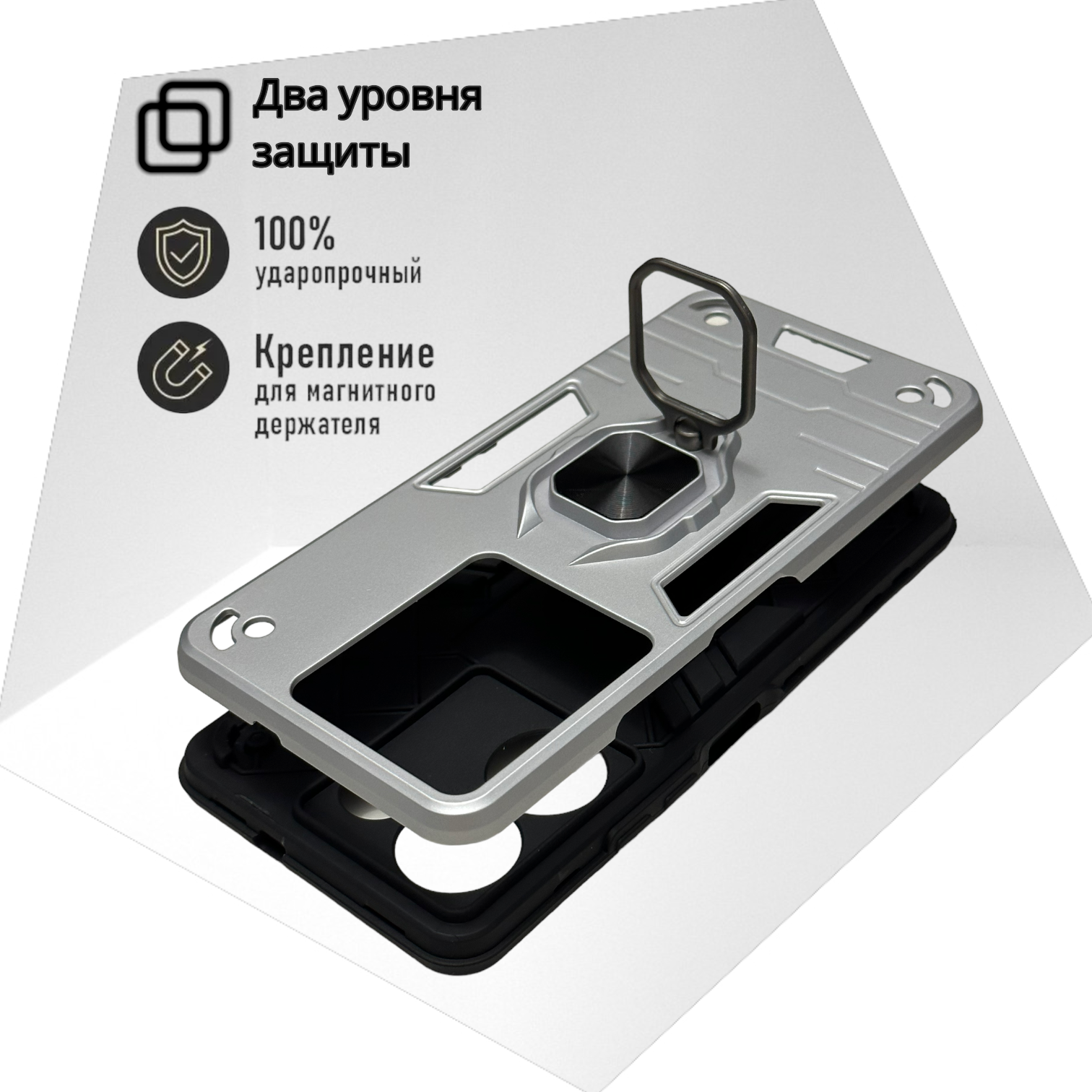 СохранитьПротивоударный чехол на Tecno Spark 20 Pro (6.78"), серебро. Кольцо-держатель и магнитное крепление, яркие пластиковые защитные вставки интересное: