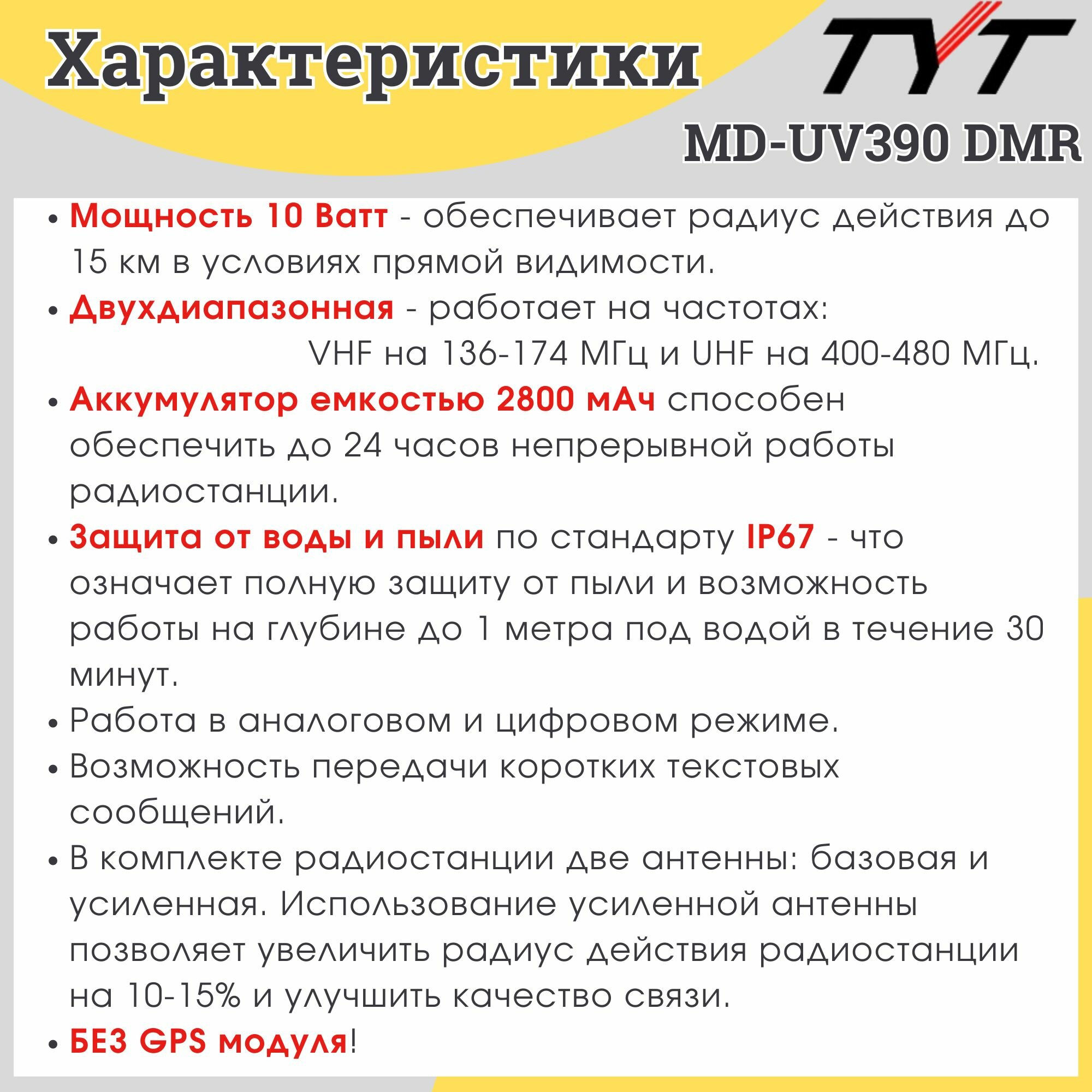 | Дополнительная информация | Цифровая радиостанция TYT MD-UV 390 DMR Диапазон частот, МГц VHF 136-174 / UHF 400-480. Питание Батарея Li-ion 7,4В/2800 мАч. Водозащищенный корпус класса IP-67, что подразумевает не только устойчивость радиостанции TYT MD-UV 390 DMR к попаданию под дождь, но и погружение в воду |