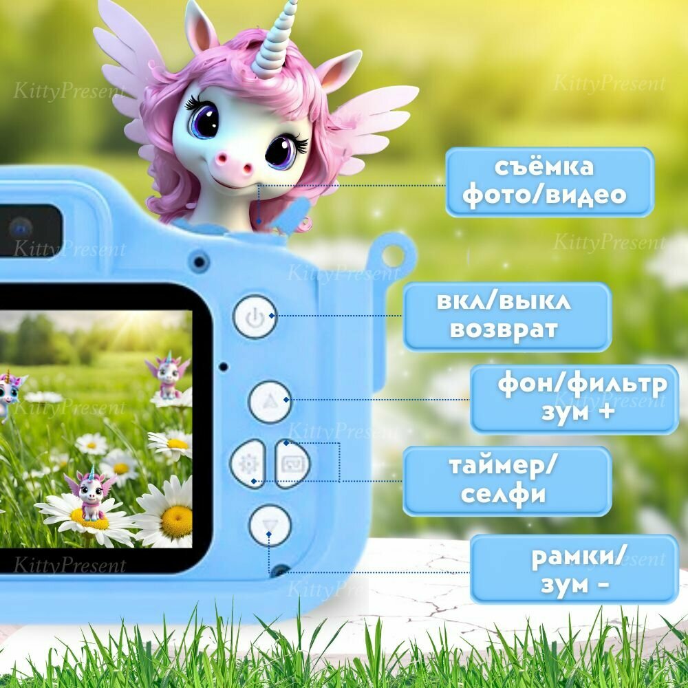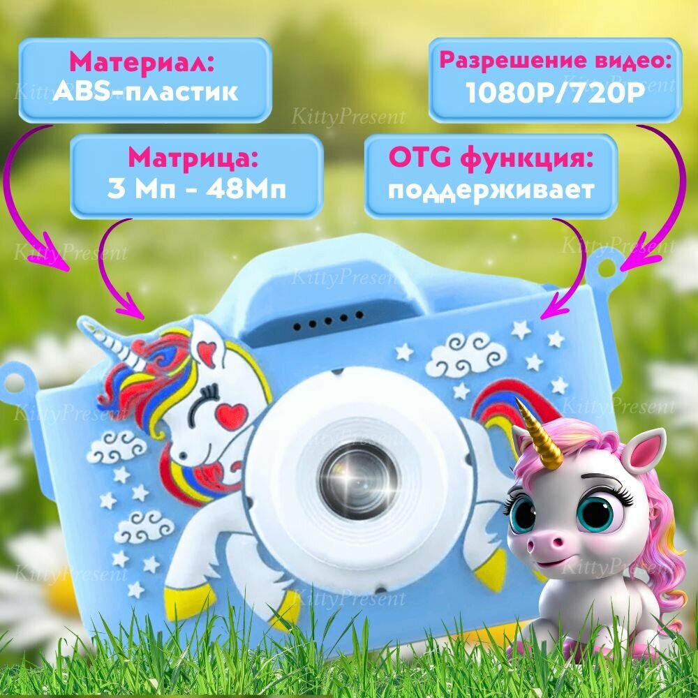 Фотоаппарат детский Единорог (голубой) 48 Мп с селфи-камерой, видео и играми + подарок интересное: