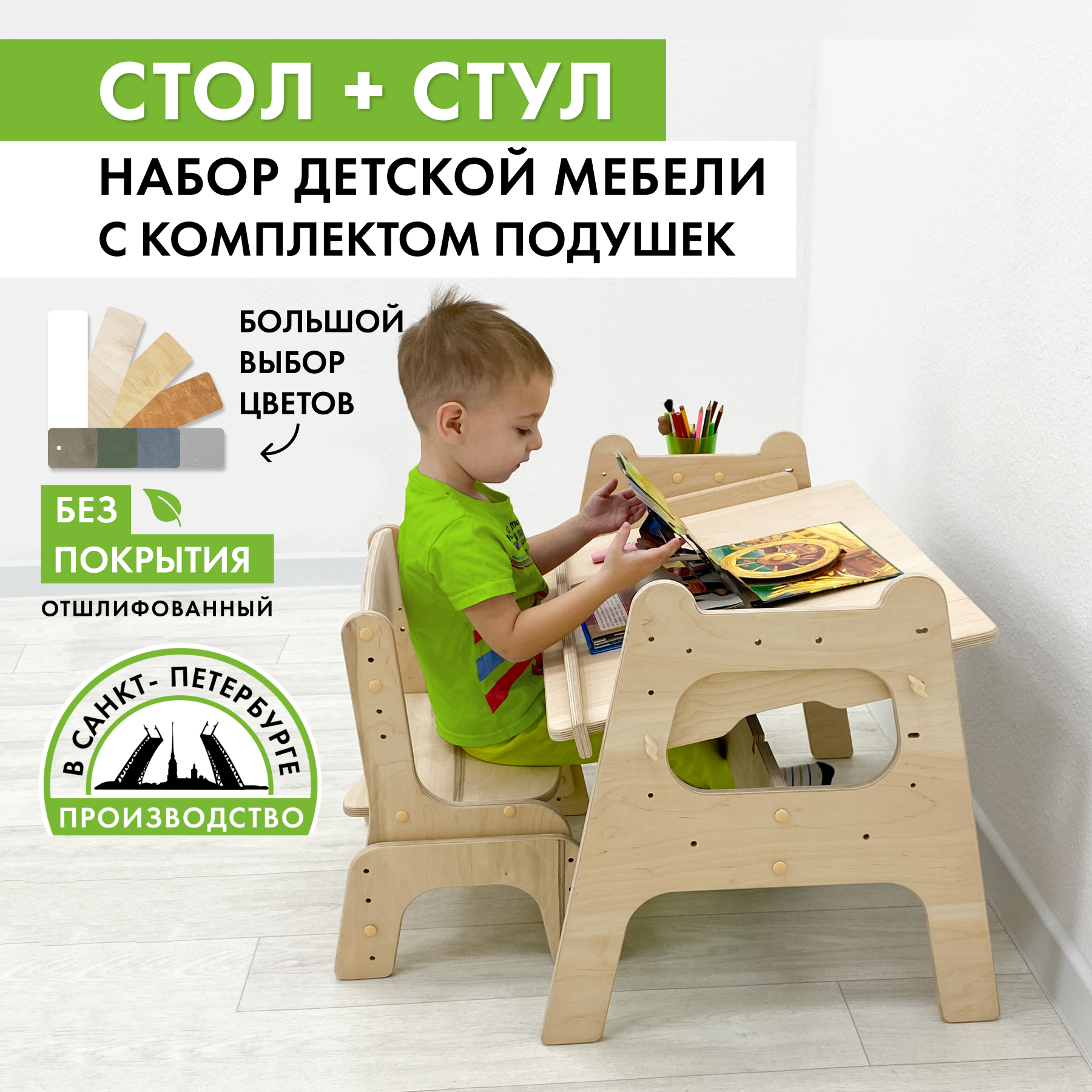 Стол детский Малышок и растущий стул, прозрачное масло, светло-серые подушки