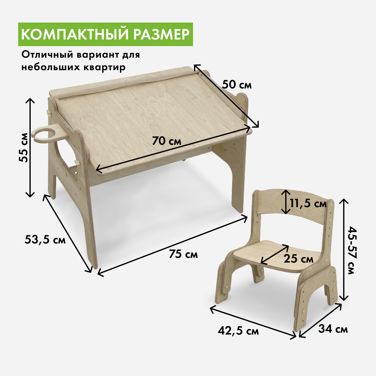 Стол детский Малышок и растущий стул, прозрачное масло, подушки хаки