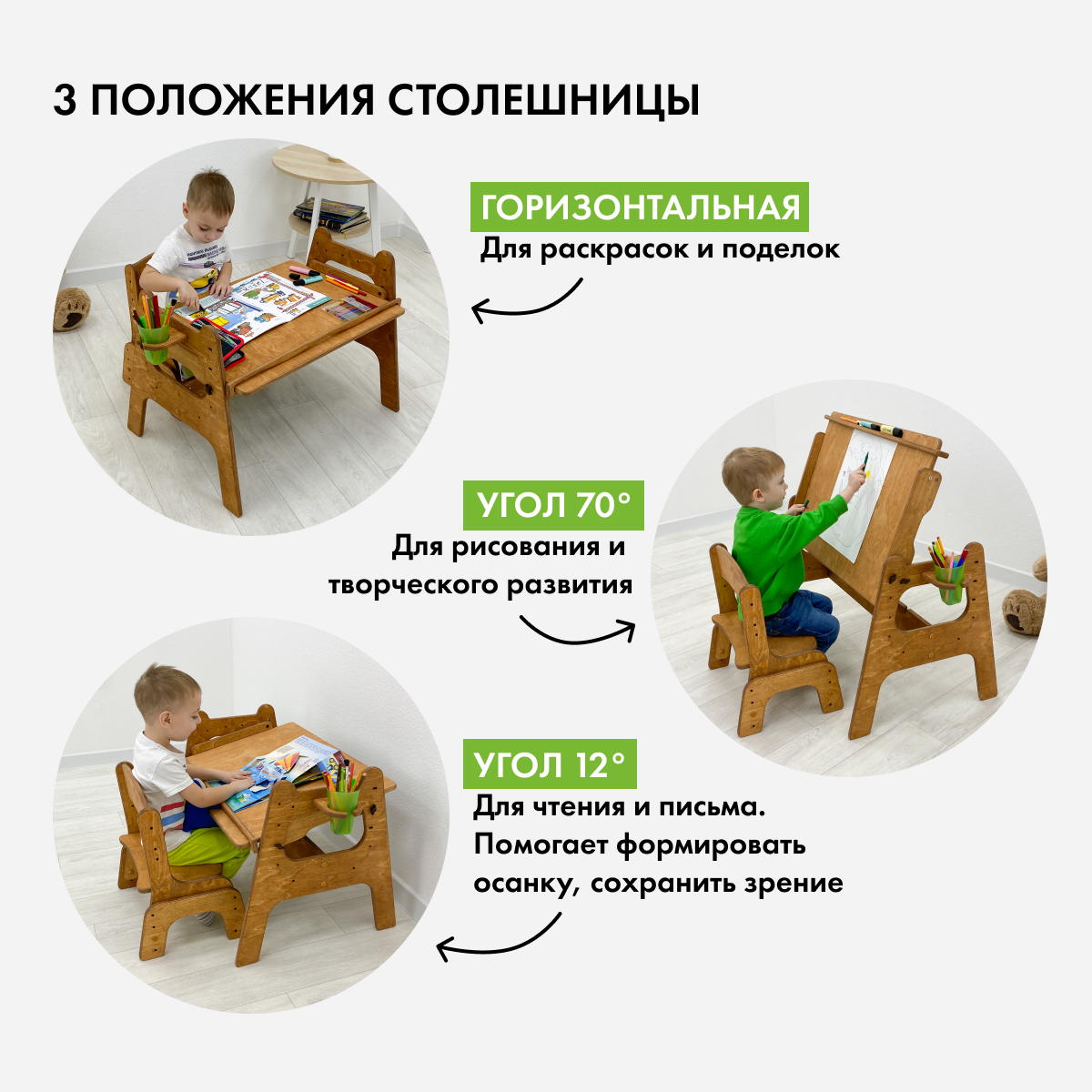 Стол детский Малышок и растущий стул, прозрачное масло, подушки хаки