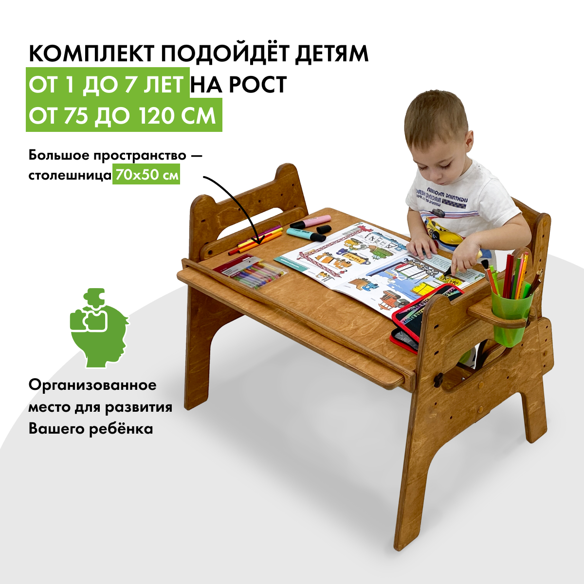 Стол детский Малышок и растущий стул, золотой дуб, подушки хаки