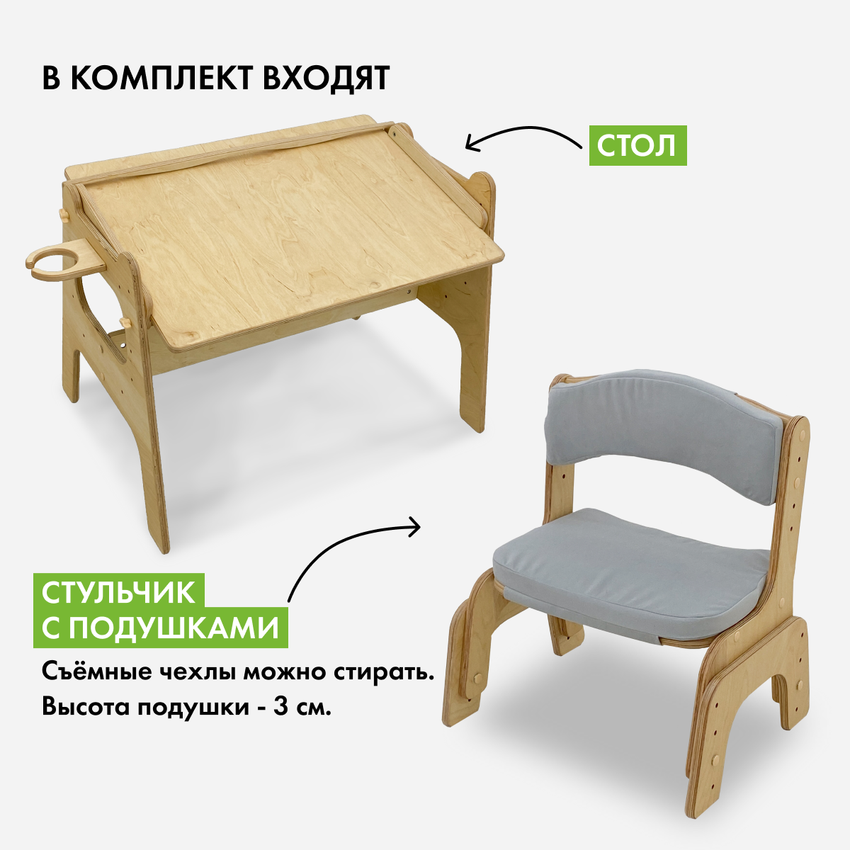 Стол детский Малышок и растущий стул, без покрытия, светло-серые подушки