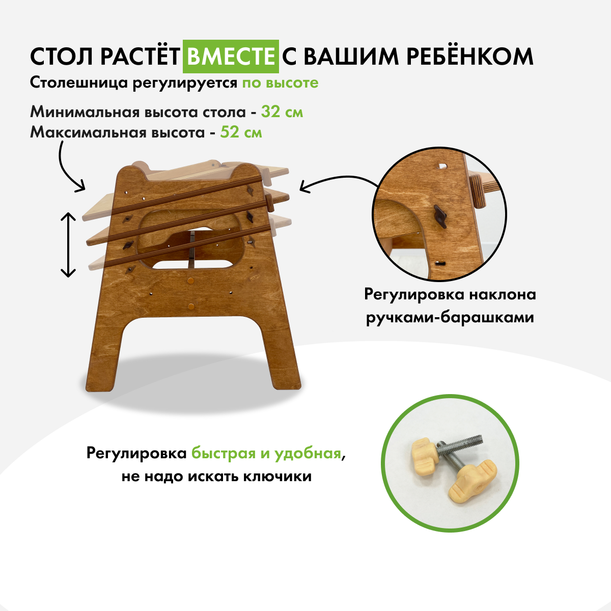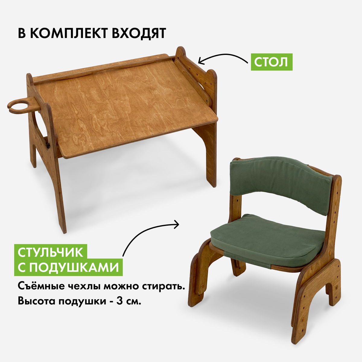 Стол детский Малышок и растущий стул, прозрачное масло, подушки хаки