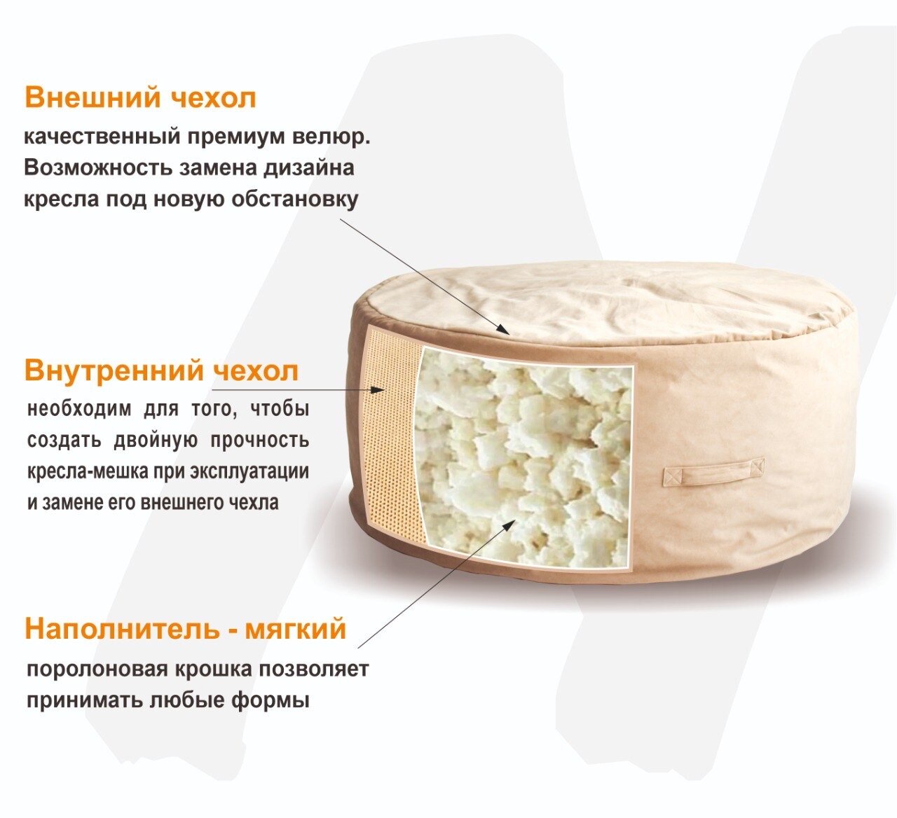 Купить Кресло-мешок огромный ,большой пуфик из натурального велюра премиум качества Nemos. размера XL,Бежевый