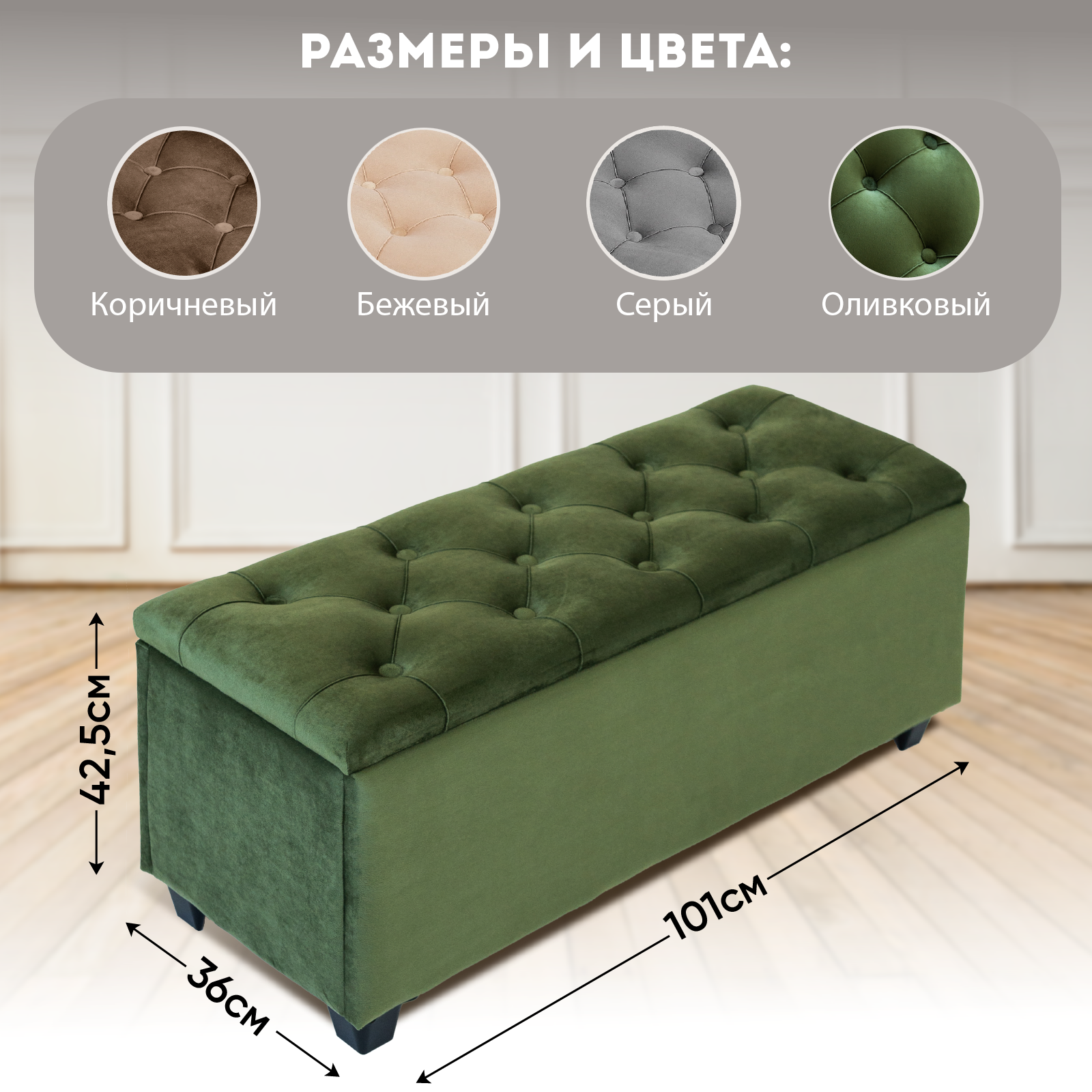 Пуф банкетка в прихожую с ящиком для хранения Классик 101х36х42, обивка вельвет оливковый, Ами Мебель, Беларусь интересное: