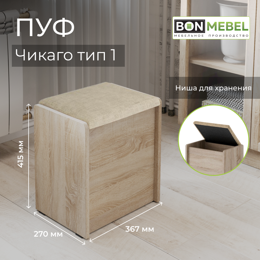 СохранитьПуф Чикаго Тип 1, Дуб сонома/Рогожка Бежевый, табурет для кухни, банкетка в прихожую, мебель для кухни, с ящиком для хранения интересное: