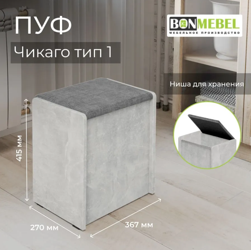 СохранитьПуф Чикаго Тип 1, BONMEBEL Ателье светлый/Рогожка Серый, табурет для кухни, банкетка в прихожую, мебель для кухни, с ящиком для хранения интересное: