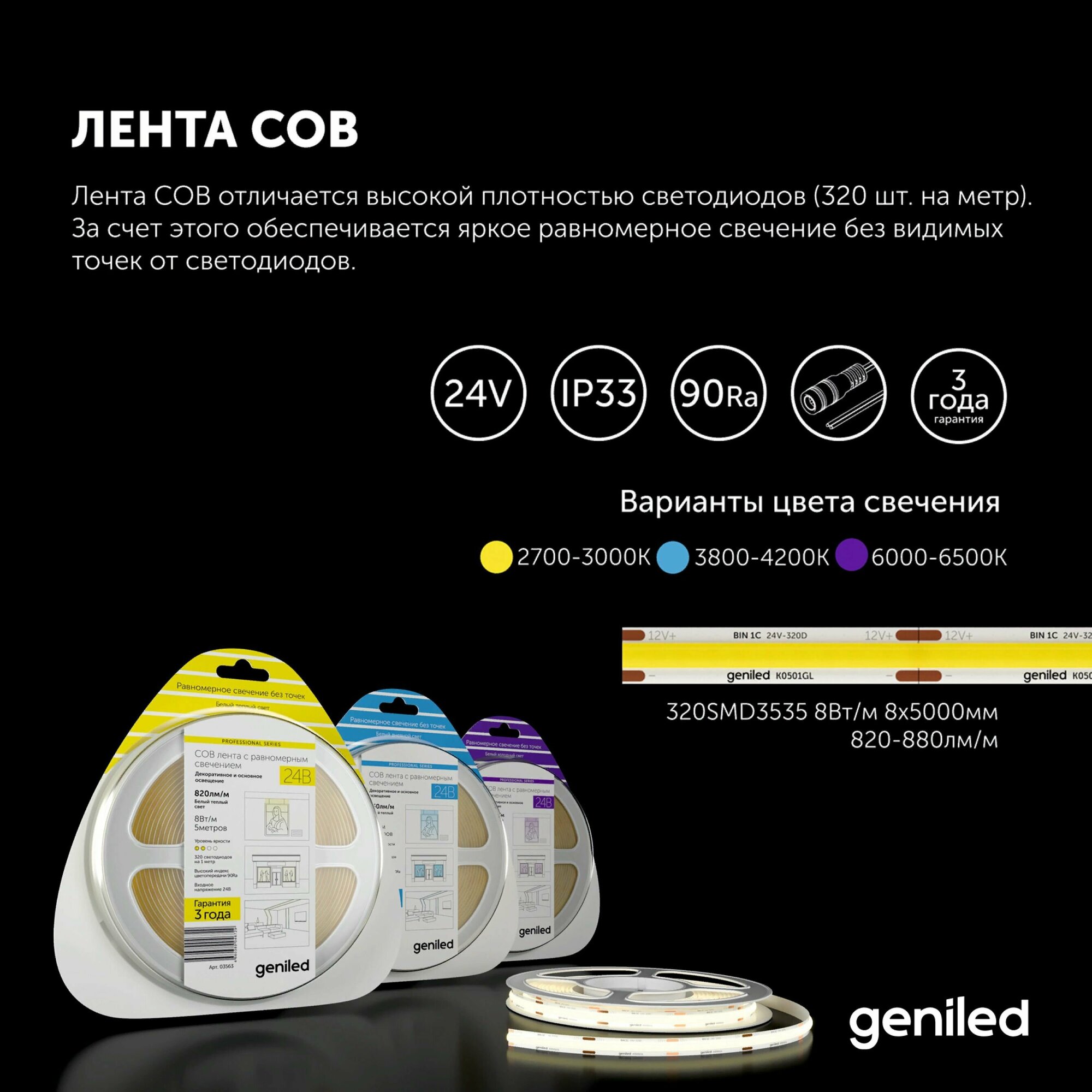 СохранитьСветодиодная лента, подсветка Geniled - для комнаты, в гардероб, на кухню - Холодный белый равномерный свет без точек COB / GL-320SMD3535 / 24В / Длина - 5м / B - 8 мм / W - 8 вт / 6500 К / IP33 интересное: