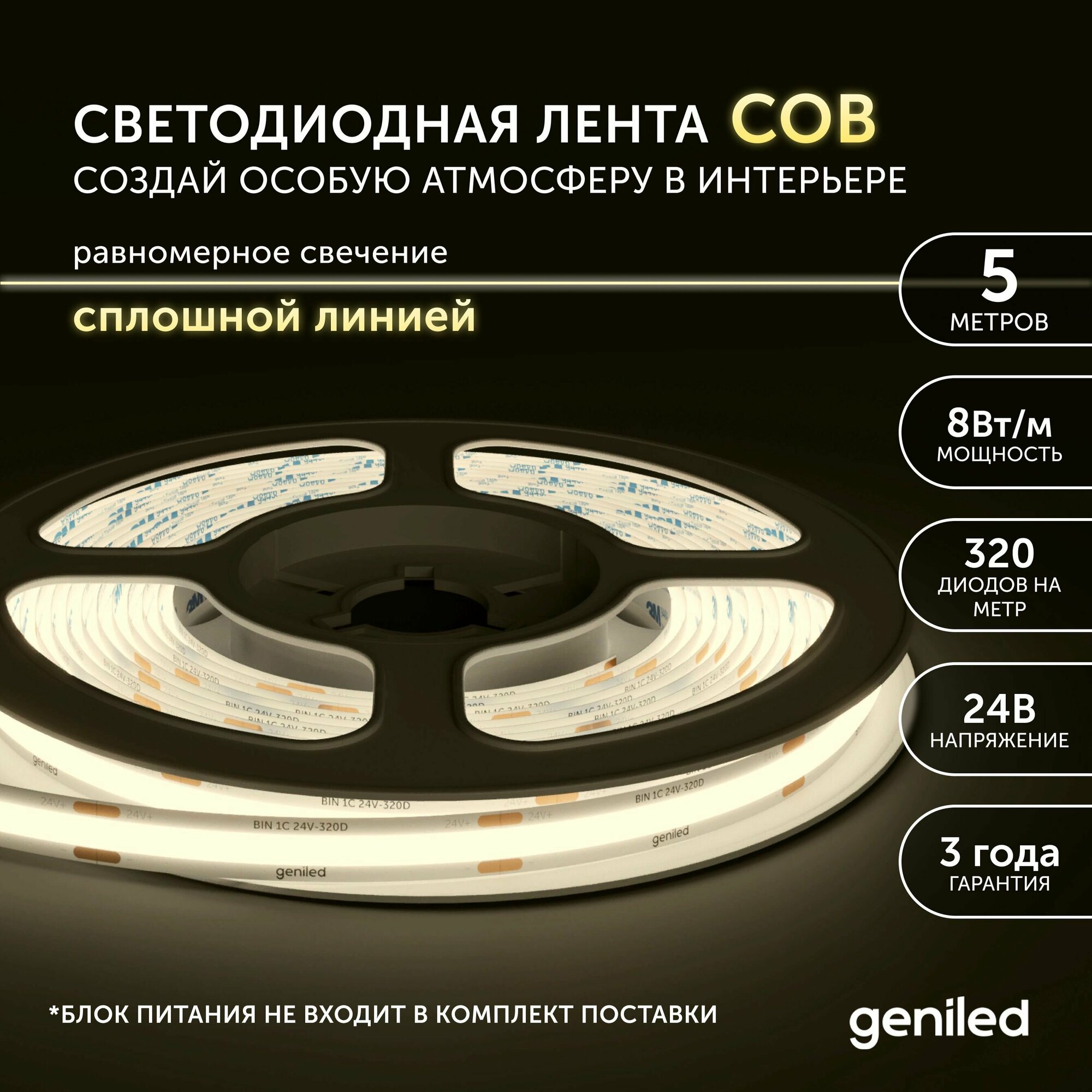 Светодиодная лента, подсветка Geniled - для комнаты, в гардероб, на кухню - Нейтральный белый равномерный свет без точек COB / GL-320SMD3535 / 24В / Длина - 5м / B - 8 мм / W - 8 вт / 4200 К / IP33