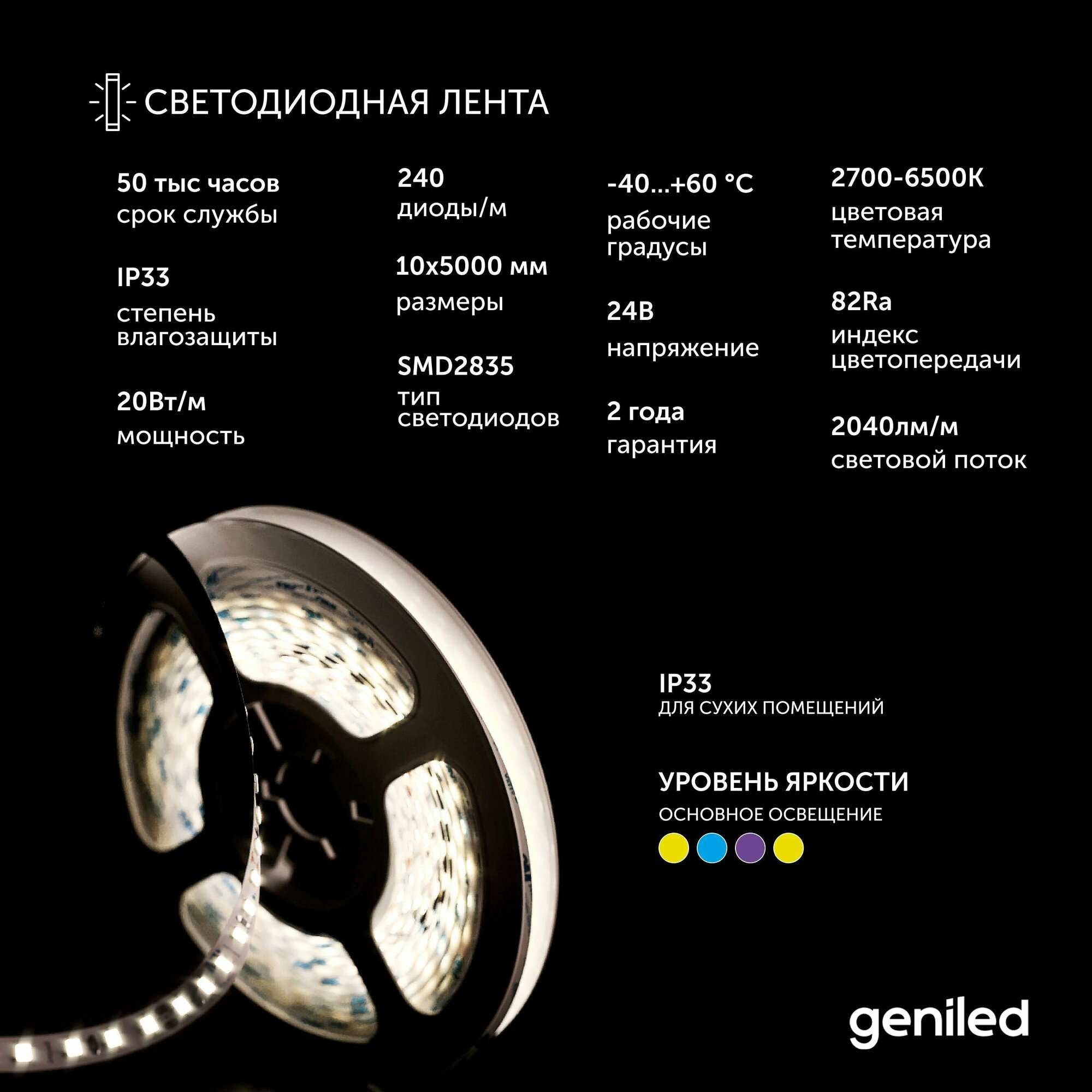 Geniled Светодиодная лента с холодным дневным и теплым светом GL- 240SMD2835 24В 2040Лм/м 20Вт/м 10х5000 MIX 2700-6500К IP33