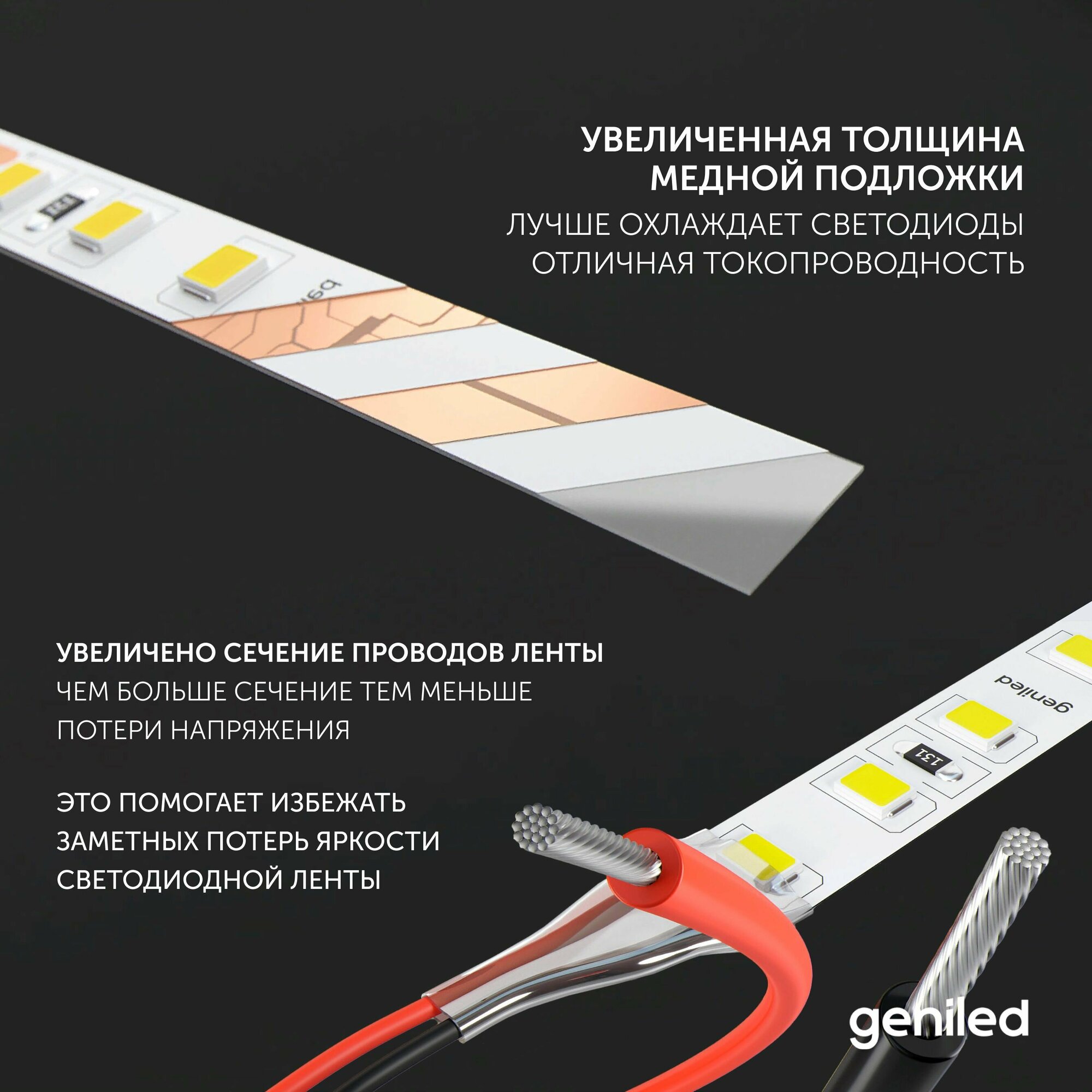 Светодиодная лента, подсветка Geniled - для комнаты, в гардероб, на кухню, на улицу, в ванную - Белый Нейтральный свет / GL-120SMD2835 / 1180 Лм/м / 12В / Длина - 5м / B - 8 мм / W - 12Вт / 4200 К / IP65