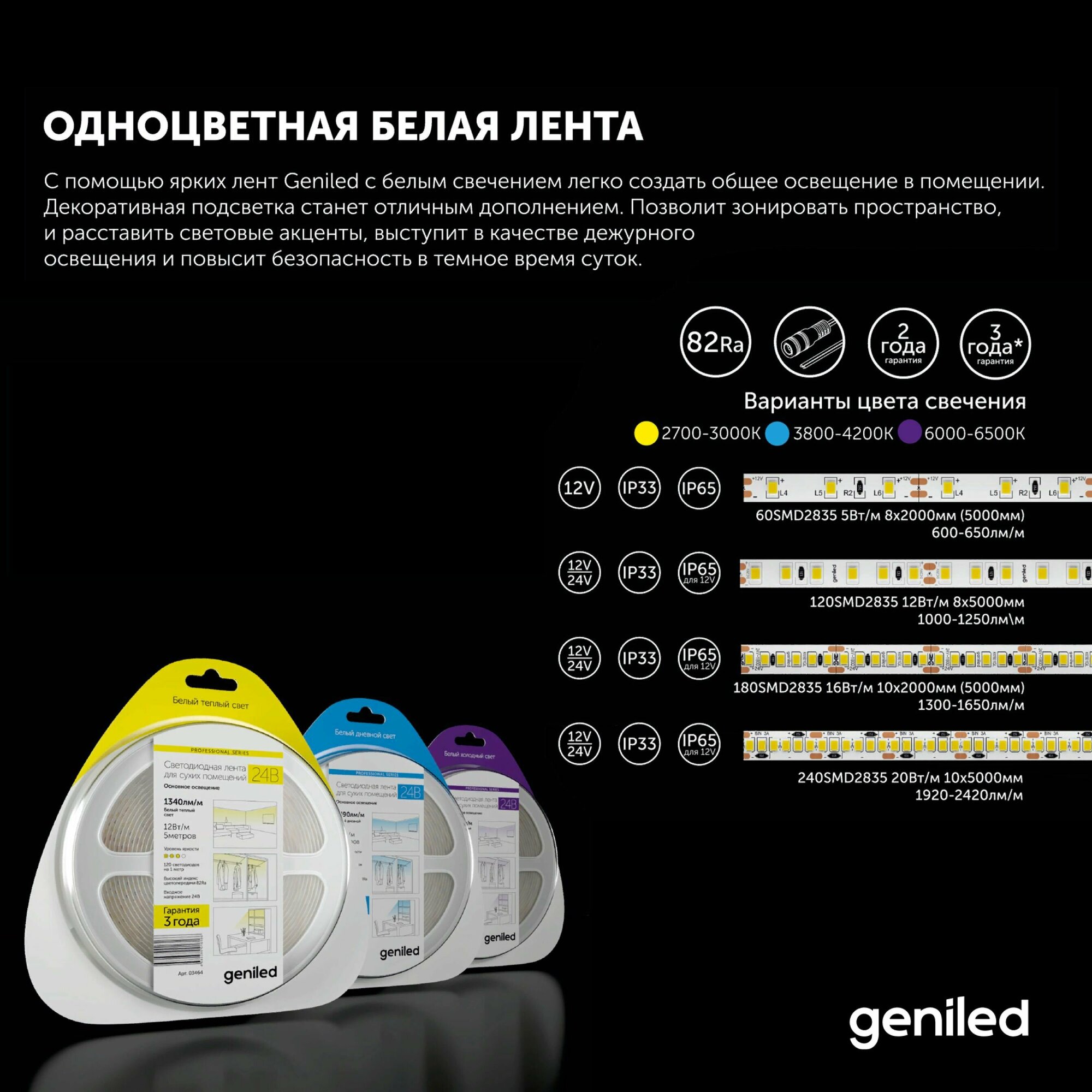 СохранитьСветодиодная лента, подсветка Geniled - для комнаты, в гардероб, на кухню, на улицу, в ванную - Белый Нейтральный свет / GL-120SMD2835 / 1180 Лм/м / 12В / Длина - 5м / B - 8 мм / W - 12Вт / 4200 К / IP65 интересное: