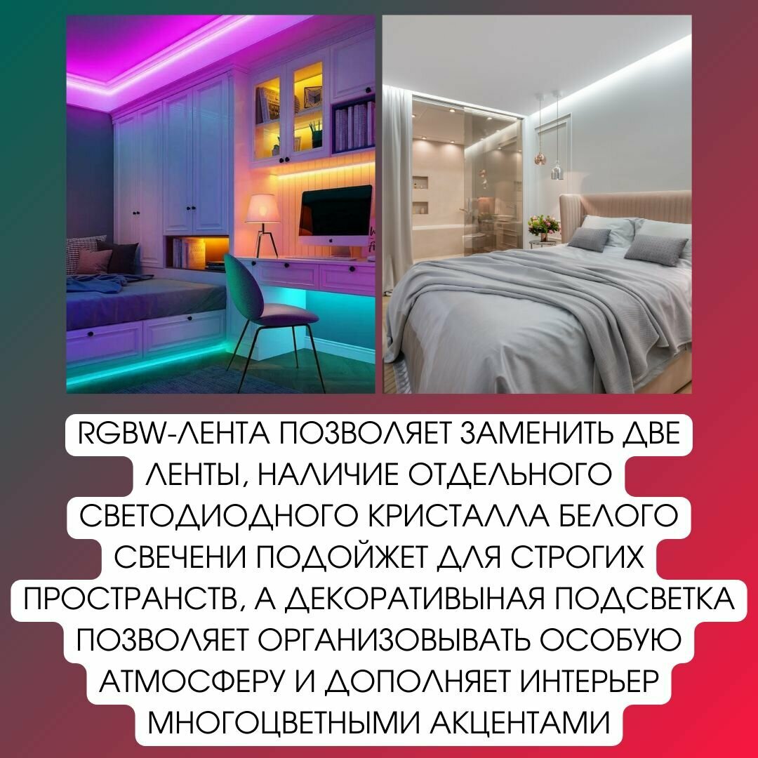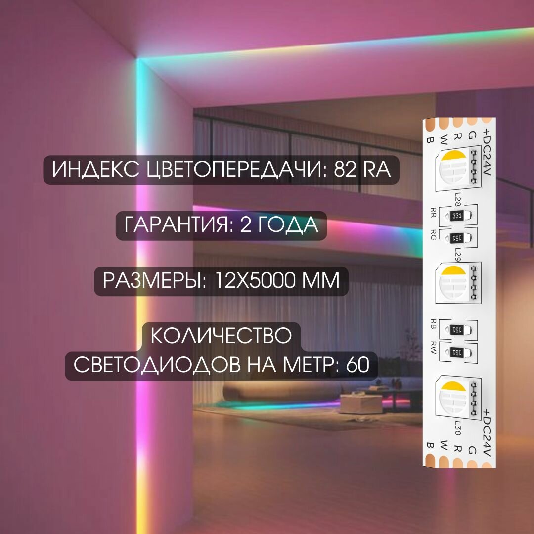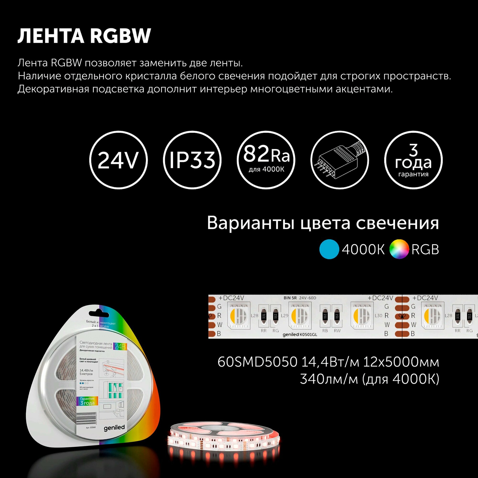 СохранитьСветодиодная лента, подсветка Geniled - для комнаты, в гардероб, на кухню - Цветная+Белый свет (RGBW) GL-60SMD5050 / 24В / Длина - 5м / B - 12 мм / W - 14,4 Вт / 4000 К / IP33 интересное: