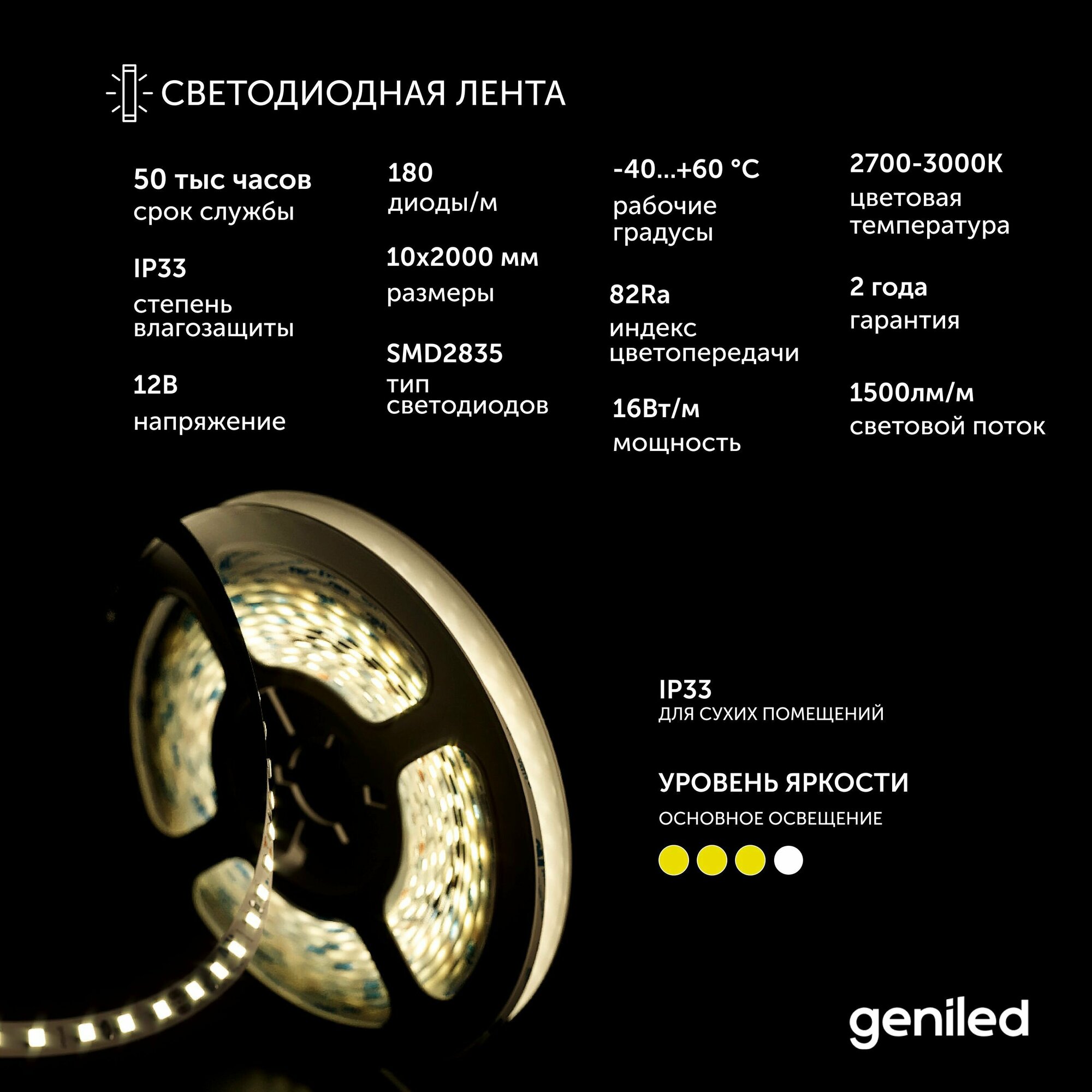 Светодиодная лента, подсветка Geniled - для комнаты, в гардероб, на кухню - Белый теплый свет / GL-180SMD2835 / 1500лм/м / 12В / Длина - 2м / B - 10 мм / W - 16 вт / 3000 К / IP65