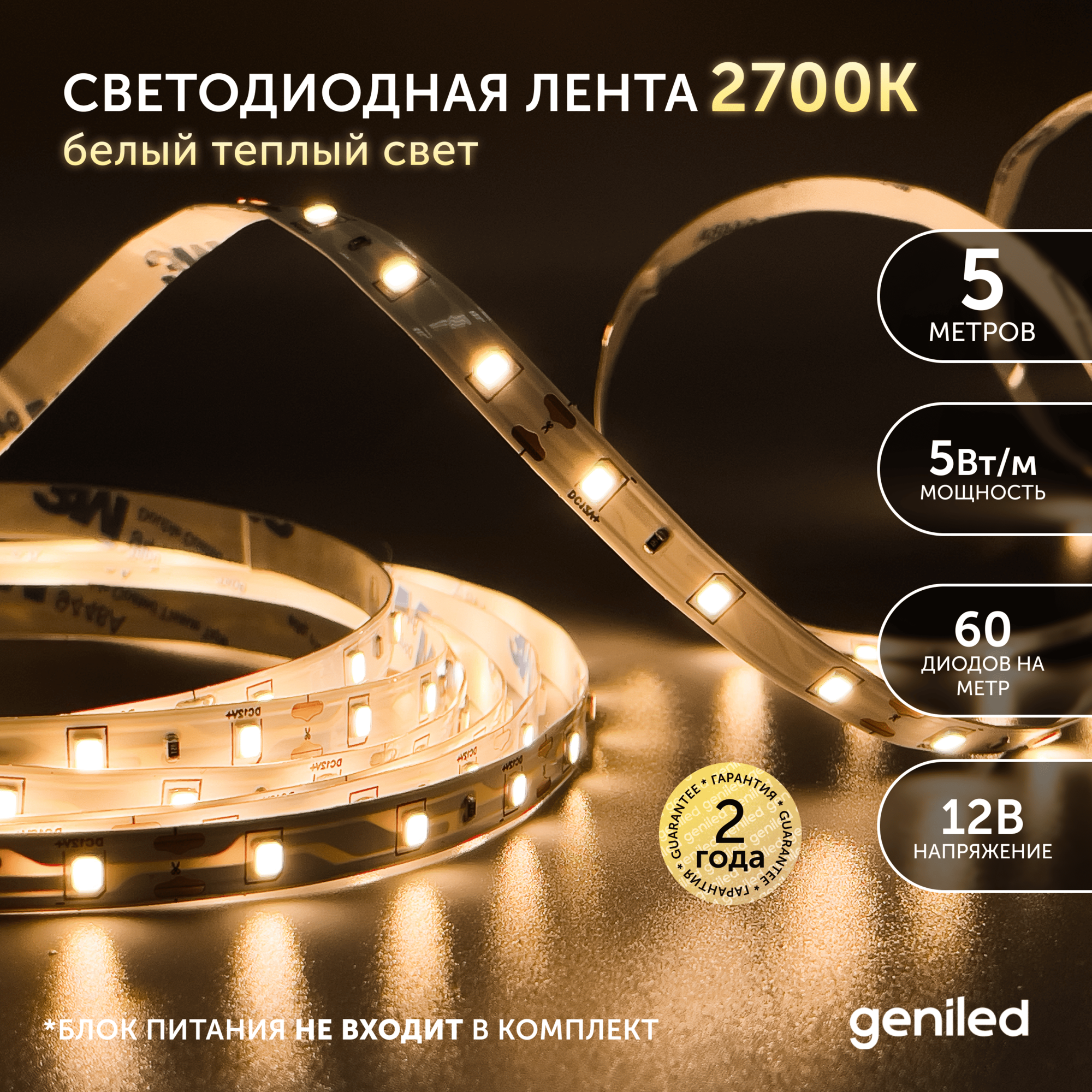 Светодиодная лента, подсветка Geniled - для комнаты, в гардероб, на кухню - Теплый белый свет / GL-60SMD2835 / 600 Лм/м / 12В / длина - 5м / B - 8 мм / W - 5 вт / 2850 К / IP33
