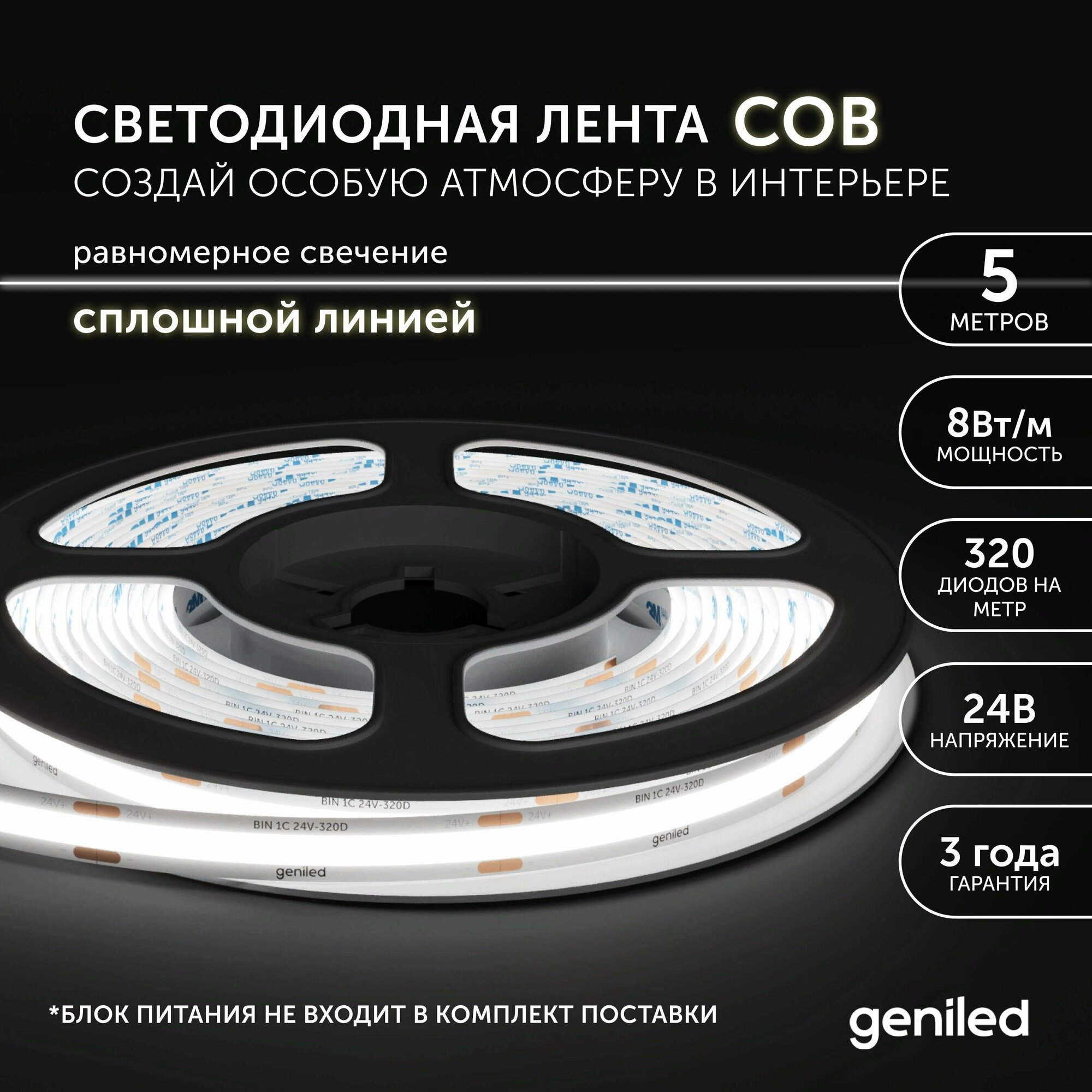 СохранитьСветодиодная лента, подсветка Geniled - для комнаты, в гардероб, на кухню - Нейтральный белый равномерный свет без точек COB / GL-320SMD3535 / 24В / Длина - 5м / B - 8 мм / W - 8 вт / 4200 К / IP33 интересное: